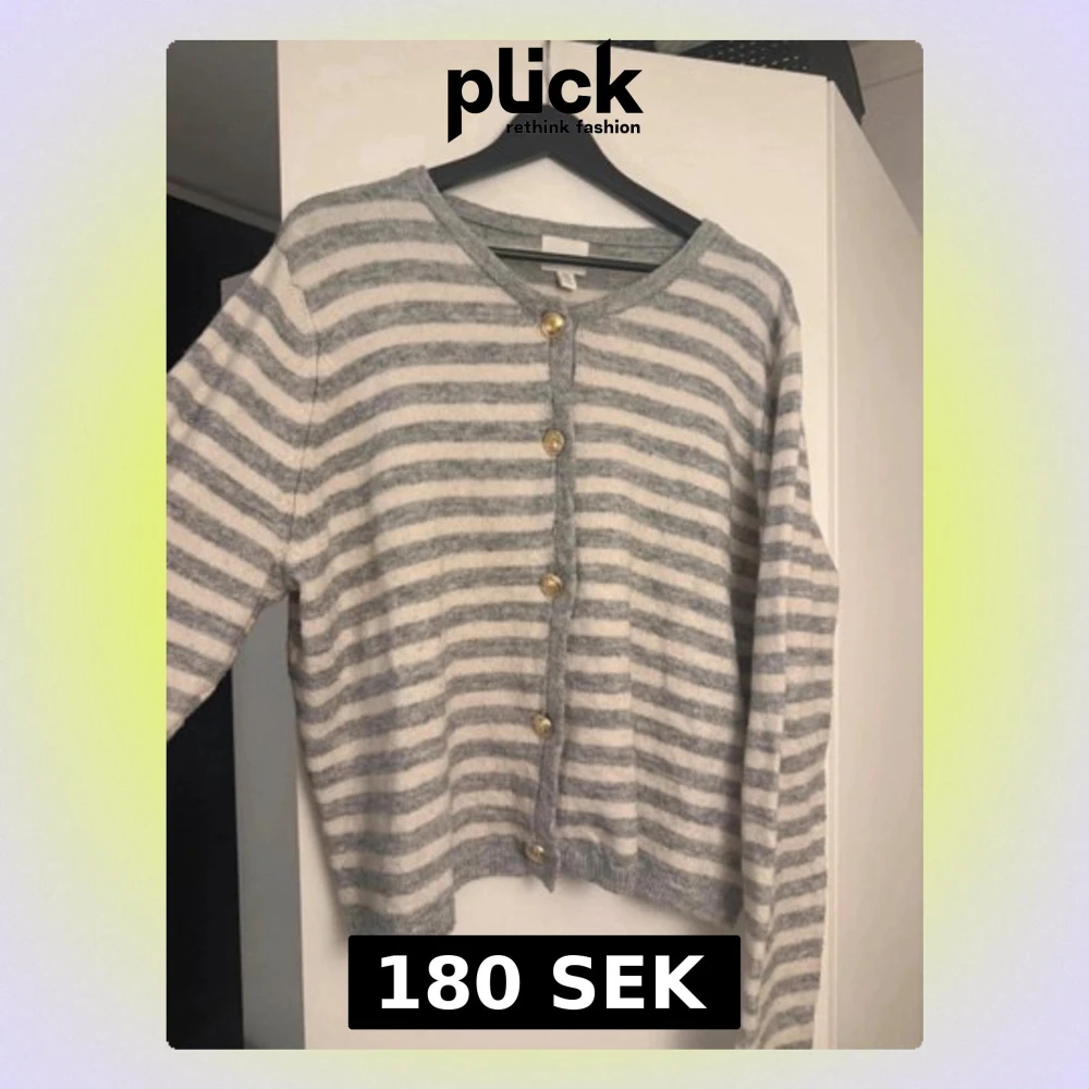 Supermysig kofta från H&M i storlek XL. Grå och vit med horisontella ränder och snygga guldiga knappar framtill. Koftan är stickad och har lång ärm, perfekt att slänga på sig när det är lite kyligt ute.