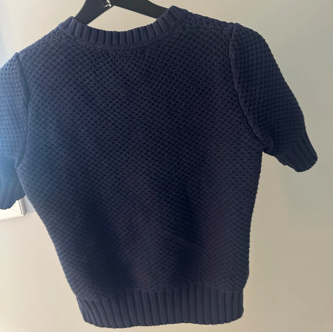 Säljer en mörkblå stickad kofta från GAP med korta ärmar och knappar framtill. Koftan har ett grovt stickat mönster och ribbade muddar vid ärmslut och nederkant.