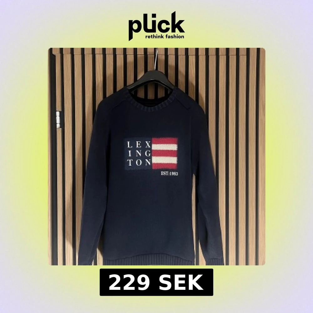 Mörkblå stickad tröja från Lexington med vit och röd broderad logga framtill. Tröjan har rund halsringning, långa ärmar och ribbade muddar vid ärmslut och nederkant. Perfekt för dig som gillar klassisk och stilren design.