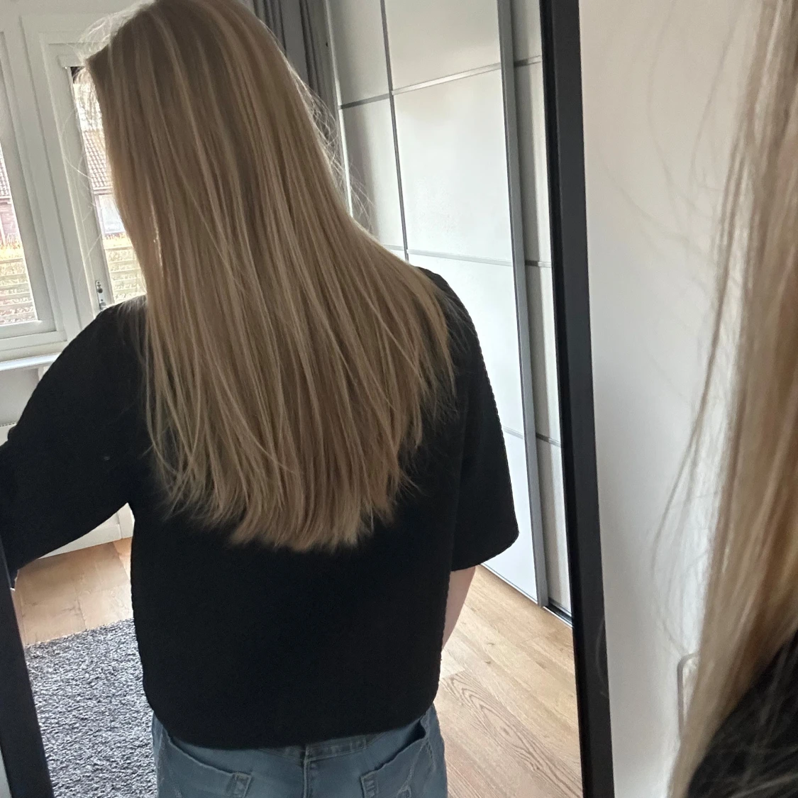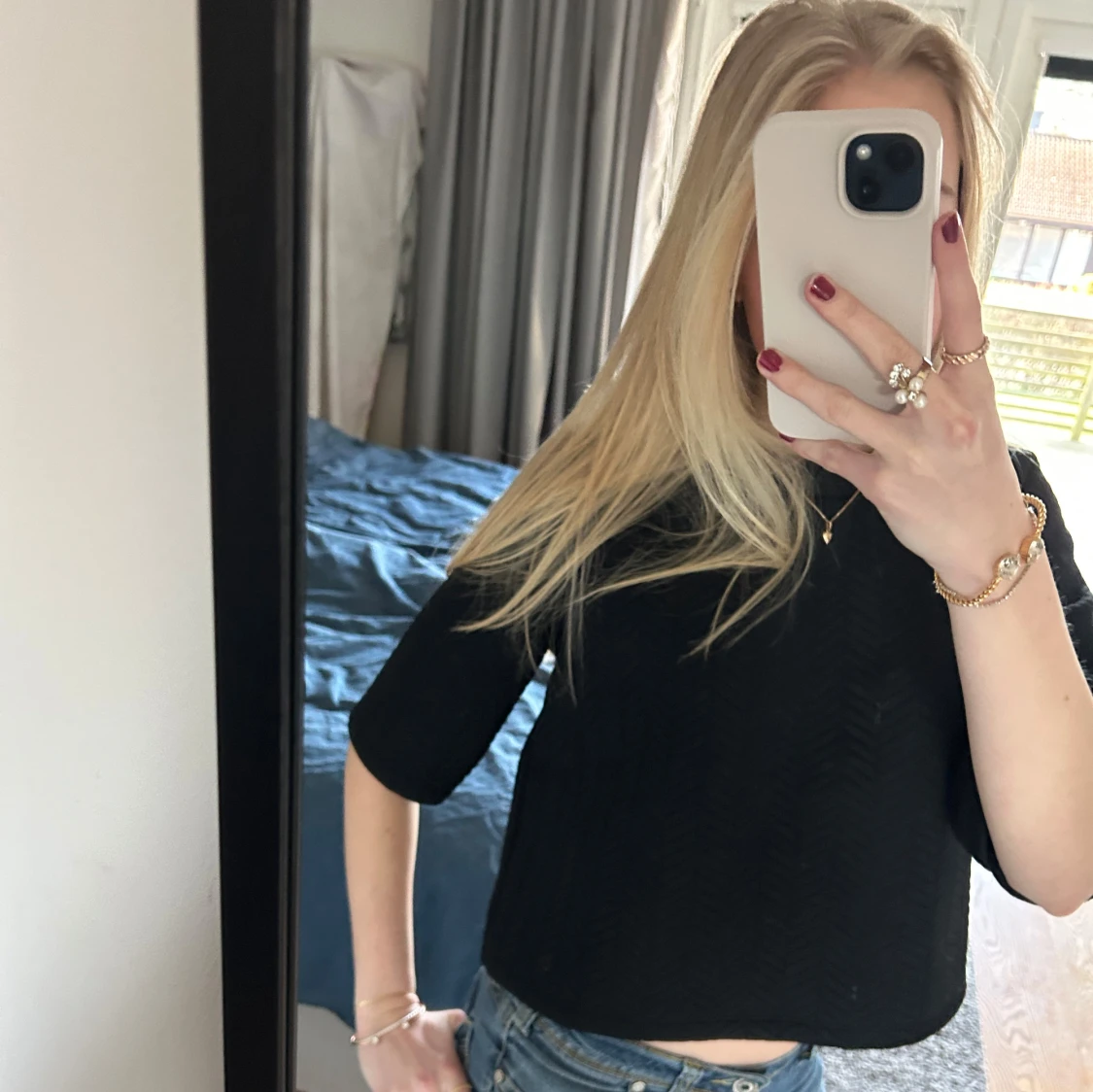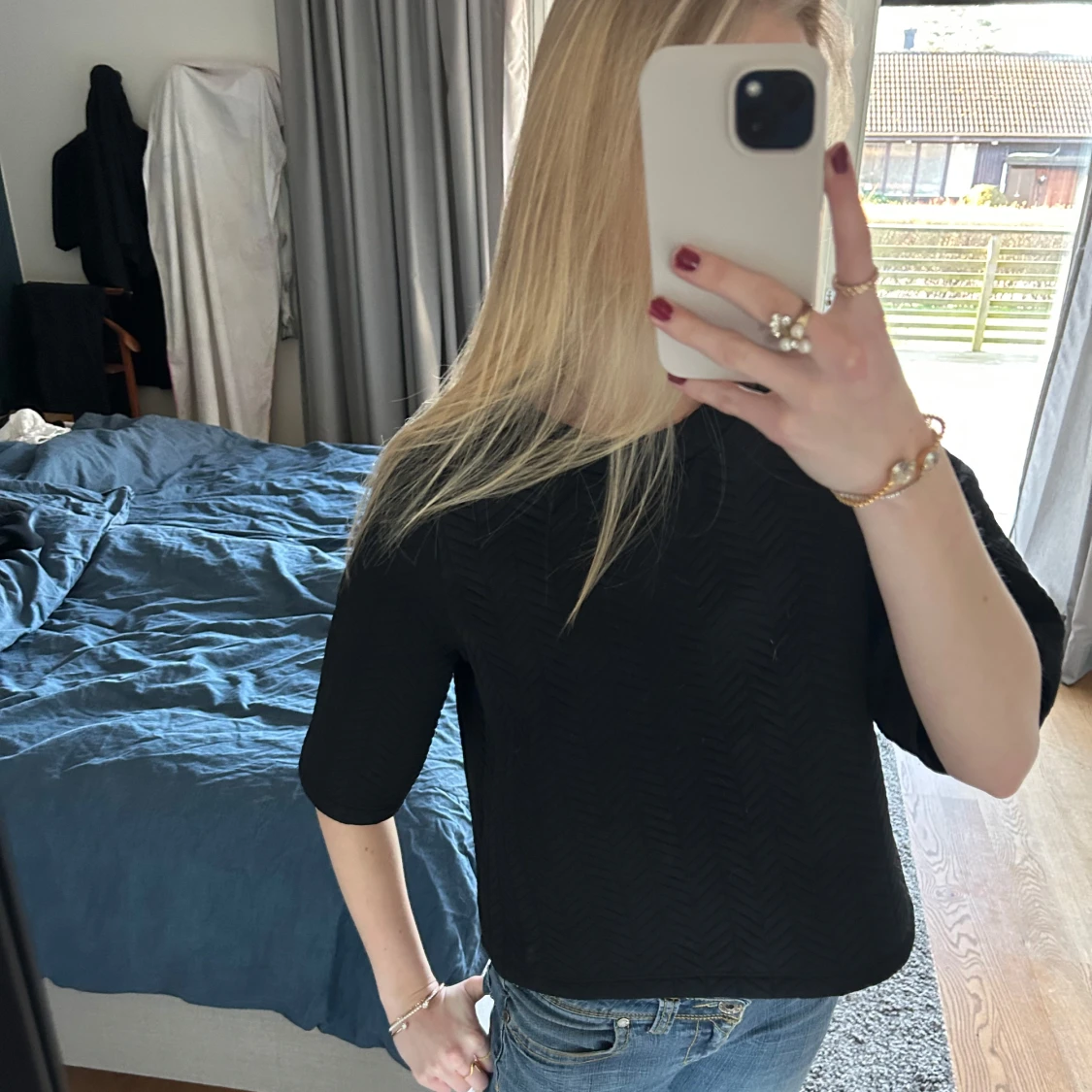 Snygg svart topp med korta ärmar och ett fint mönster. Tröjan är i storlek S och är från Monki, men ursprungligen köpt från Sellpy💗💗