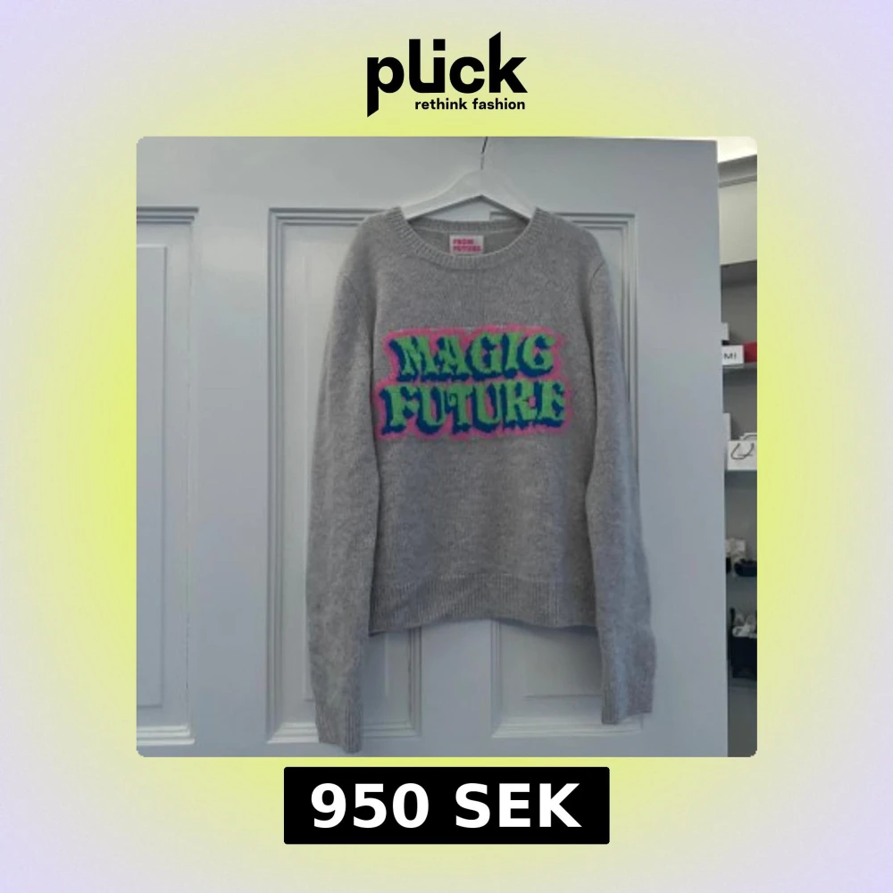 En grå cashmere tröja från from future, med färgglad text 'Magic Future' i grönt, blått och rosa på framsidan. Sparsamt använd och i absolut nyskick! Storlek S