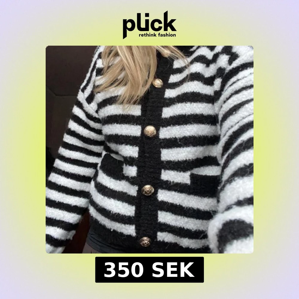Säljer en mysig randig kofta i svart och vit med guldknappar. Koftan har långa ärmar och en oversize passform. Nypris 600kr