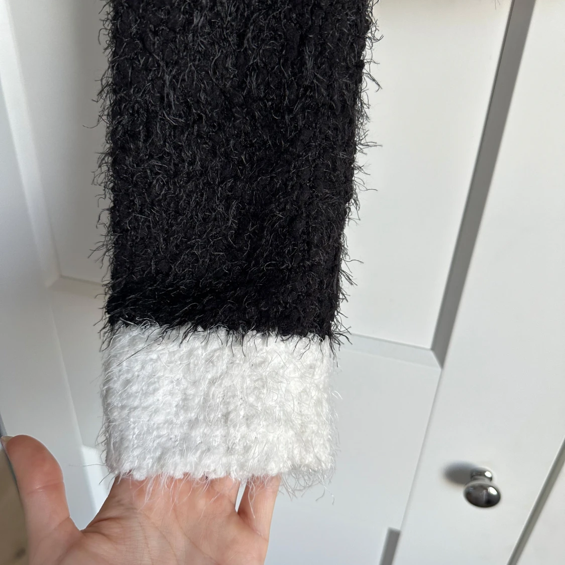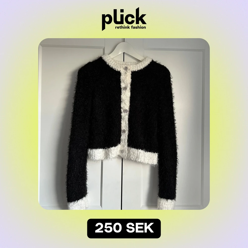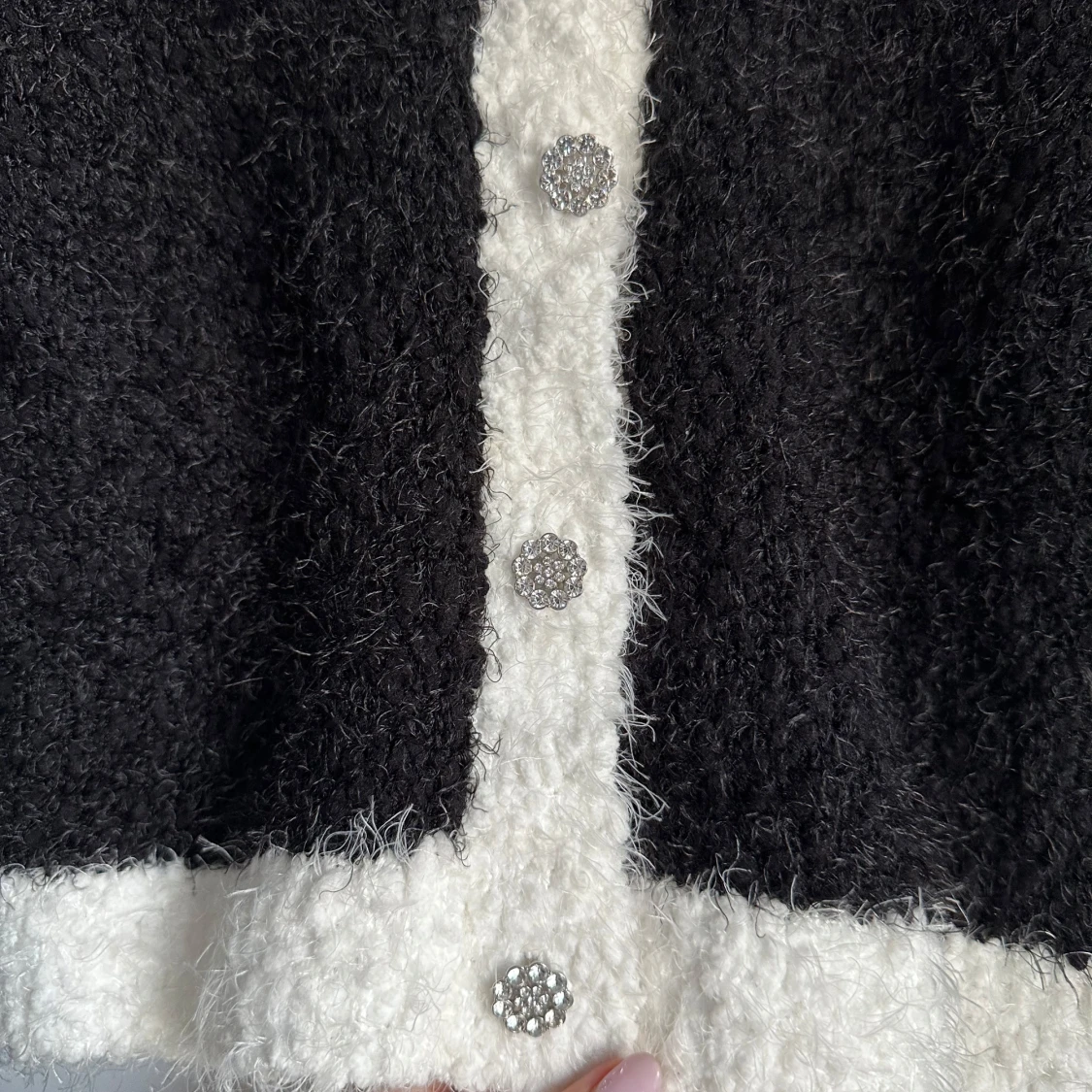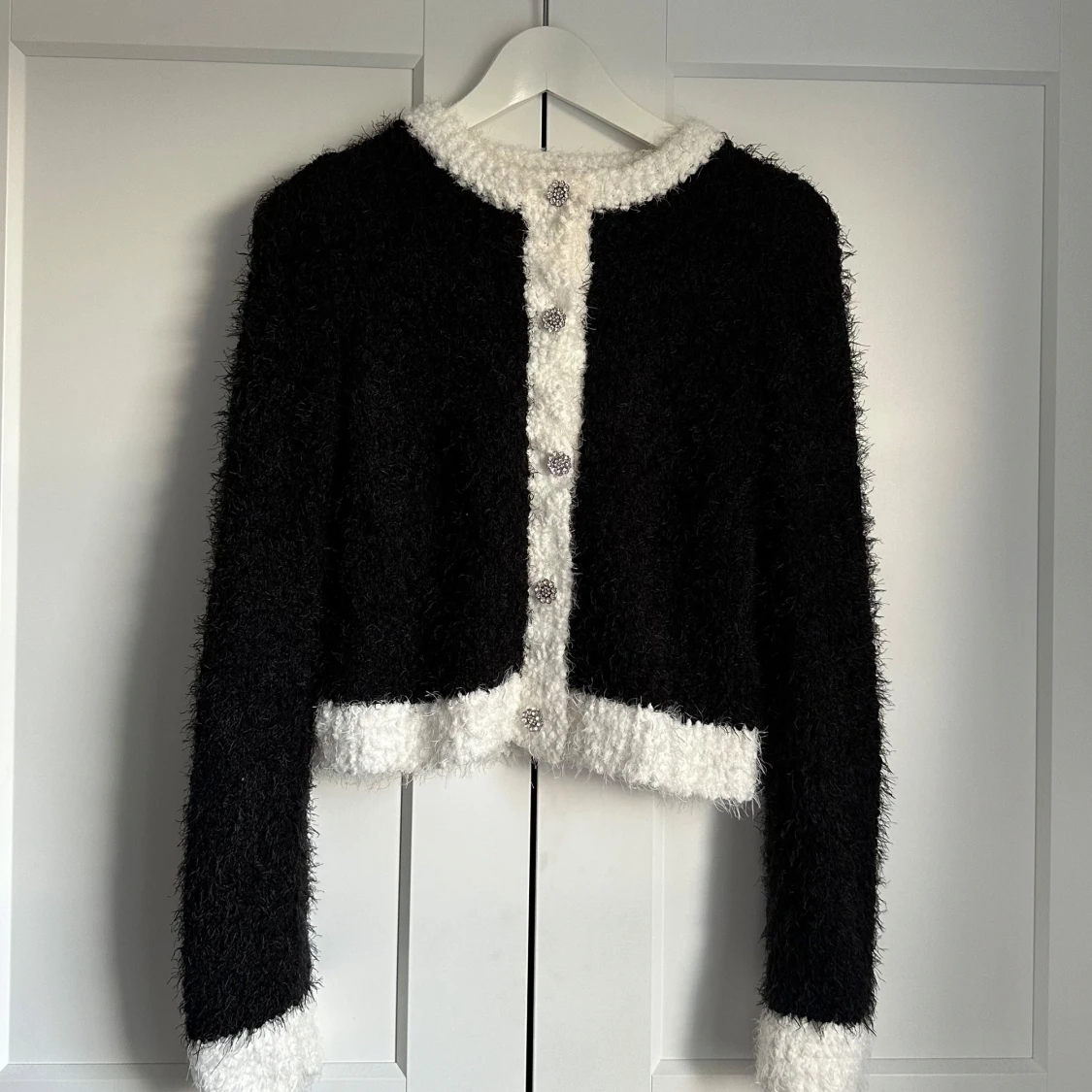 Superfin svart och vit kofta med fluffigt material och glittriga knappar. Från hm i storlek XS. Använd vid ett tillfälle. Superbra skick. Köparen står för frakten🤍
