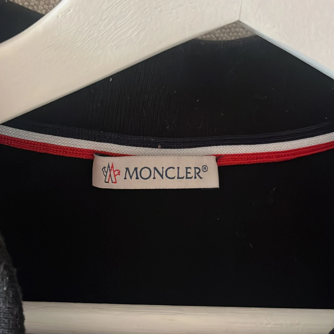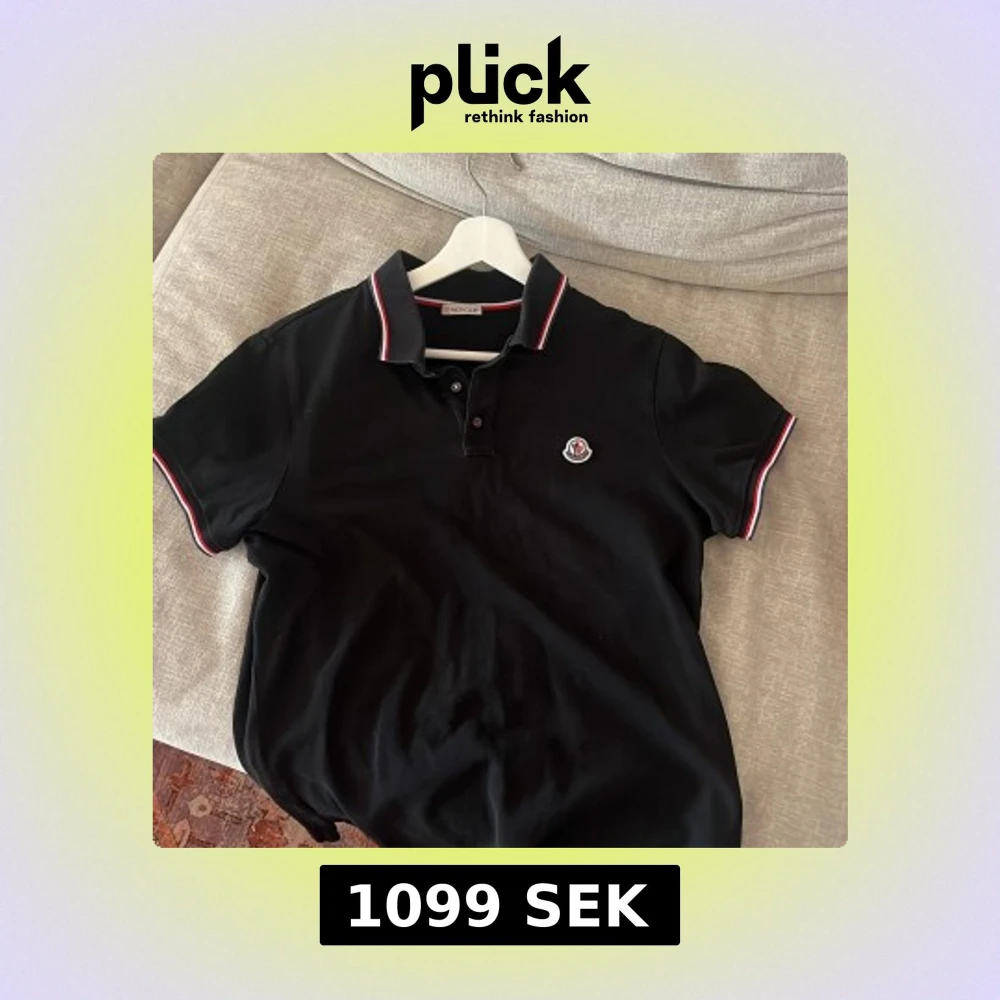 Snygg svart pikétröja från Moncler med klassisk krage och knappar. Tröjan har Monclers logotyp på bröstet och röd-vita detaljer på krage och ärmslut. Perfekt för en stilren look.
