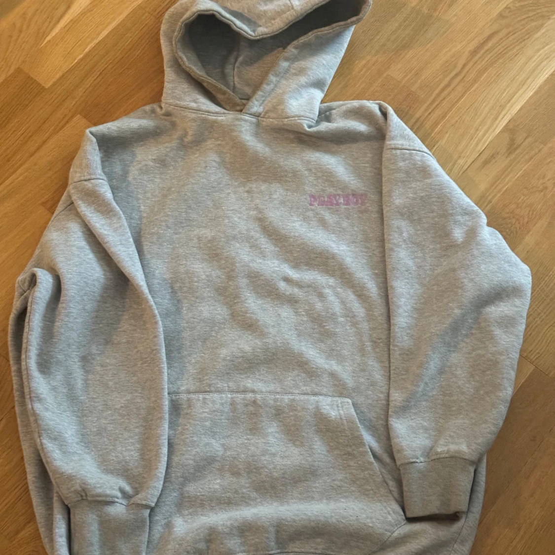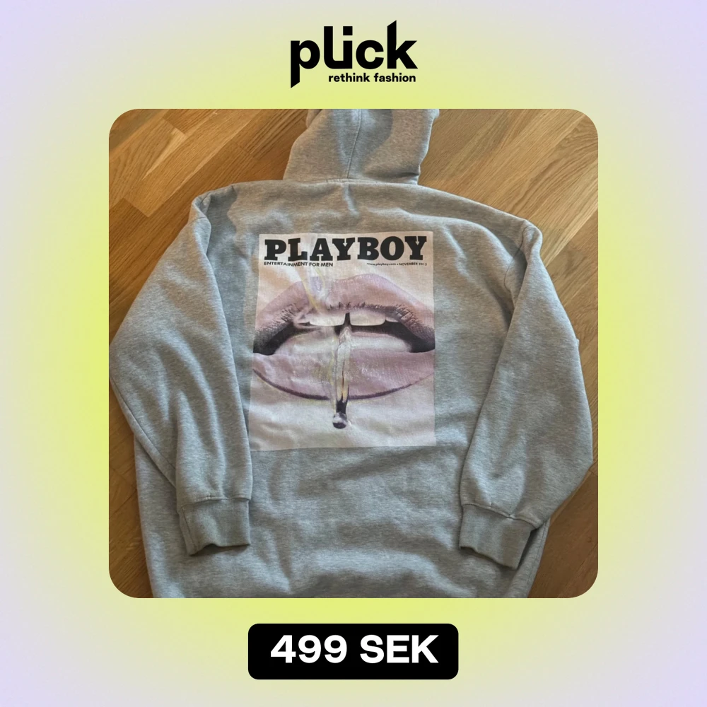 Säljer en grå hoodie med stort Playboy-tryck på ryggen. Den har en klassisk känguruficka och en bekväm huva. Perfekt för en avslappnad stil och att hålla sig varm under kyliga dagar. Passar både till vardags och chillkvällar.