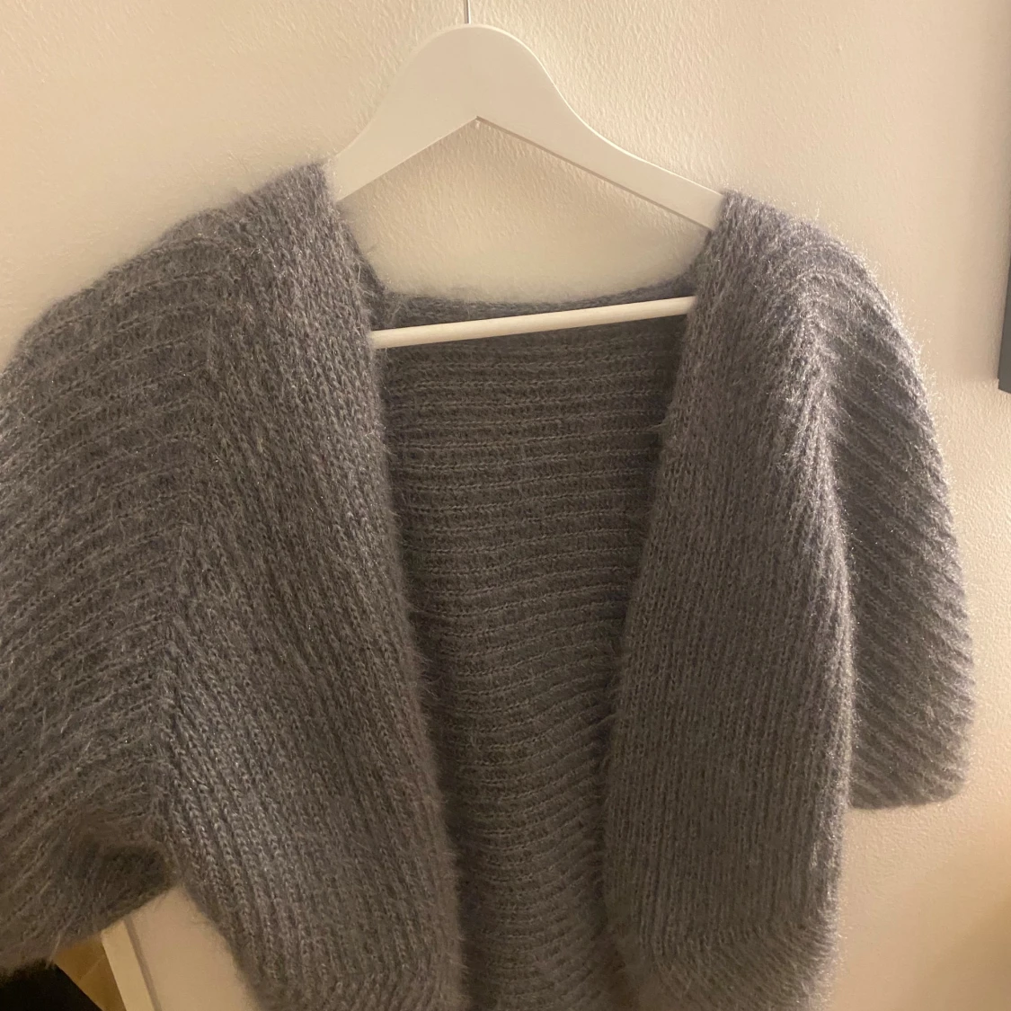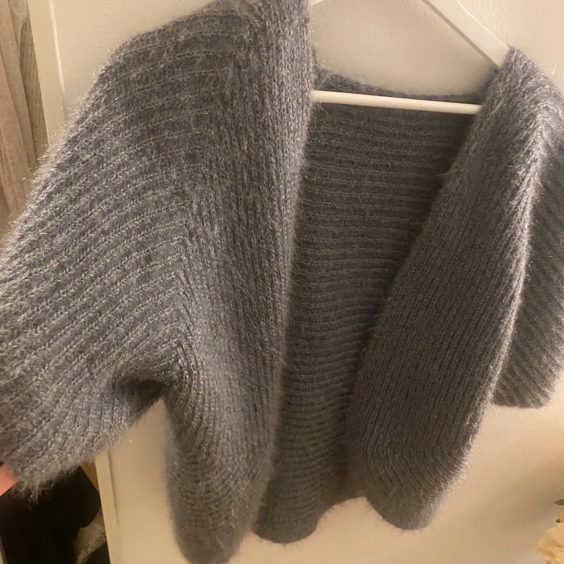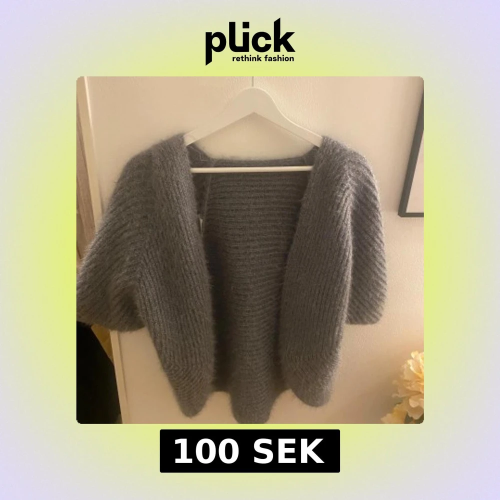 Mysig och fluffig mörkgrå stickad kofta med breda ärmar och öppen front. Kommer inte ihåg vart ja köpte den men den är aldrig använd. Passar S-M