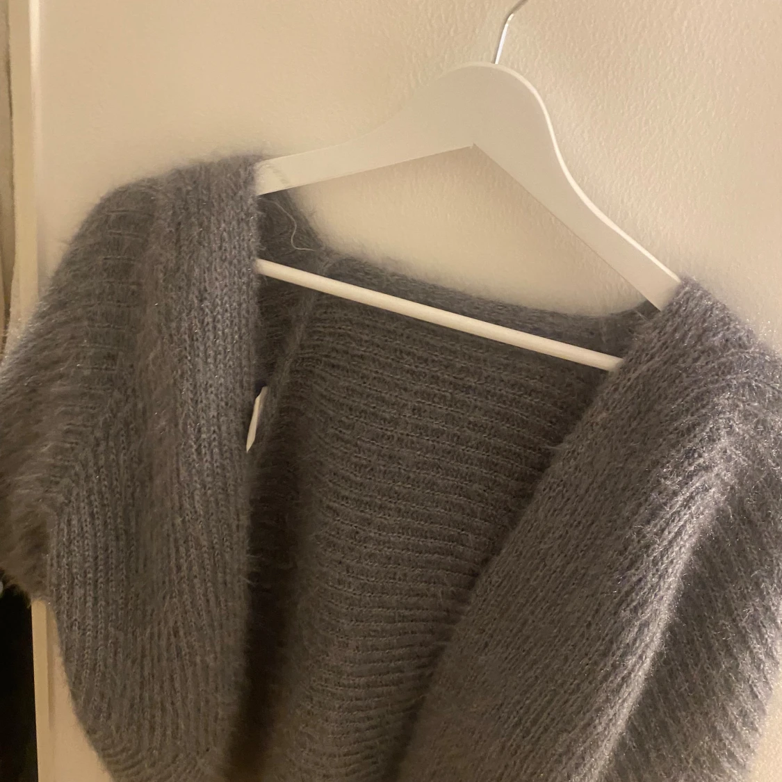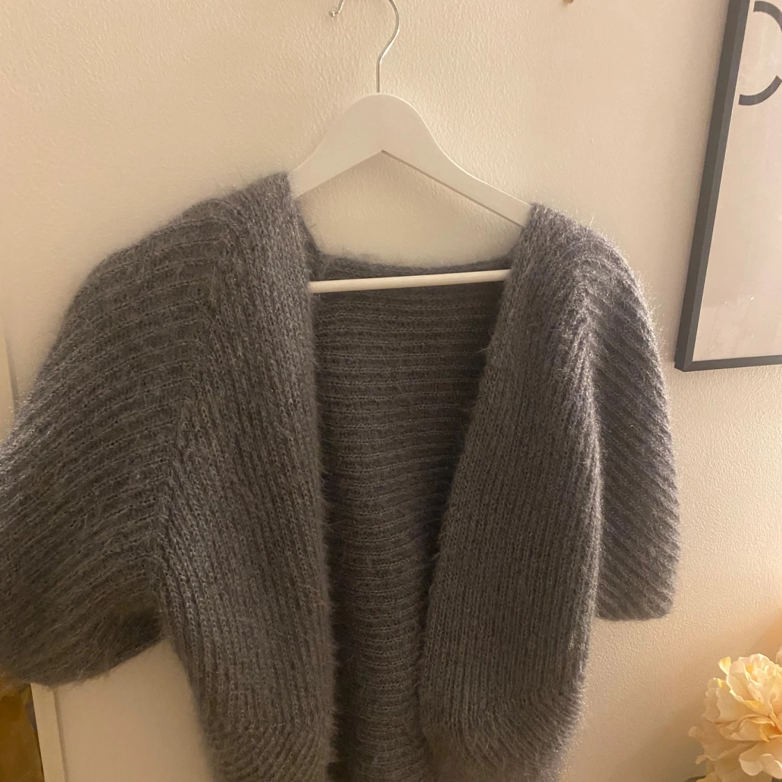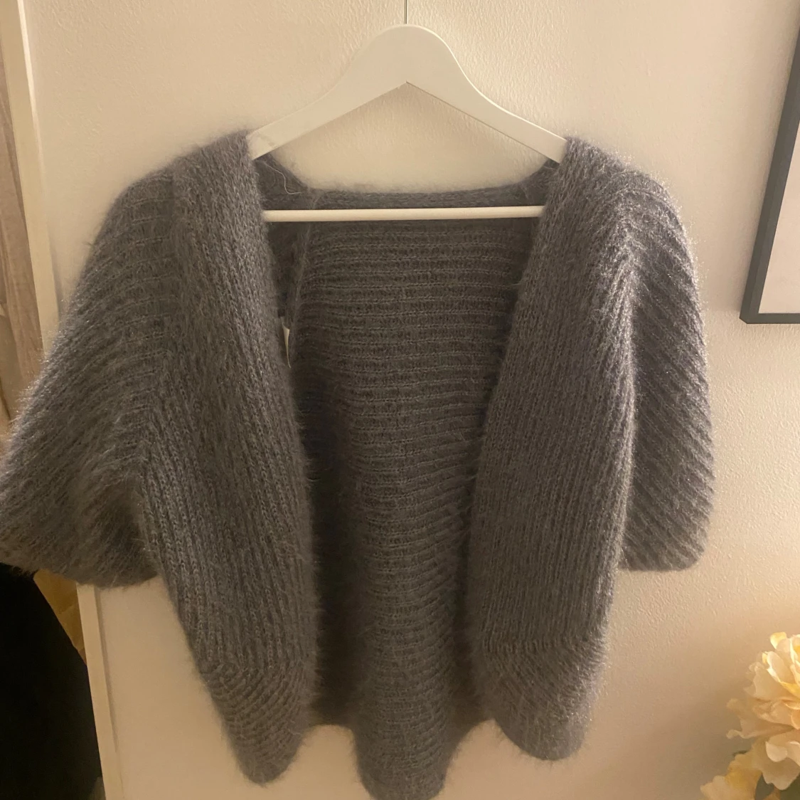 Mysig och fluffig mörkgrå stickad kofta med breda ärmar och öppen front. Kommer inte ihåg vart ja köpte den men den är aldrig använd. Passar S-M