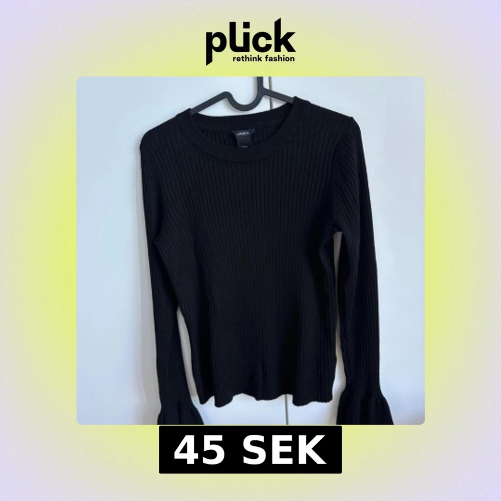 Ribbad tröja med trumpetarmar. Finns en liten fläck på ena armen (se bild).