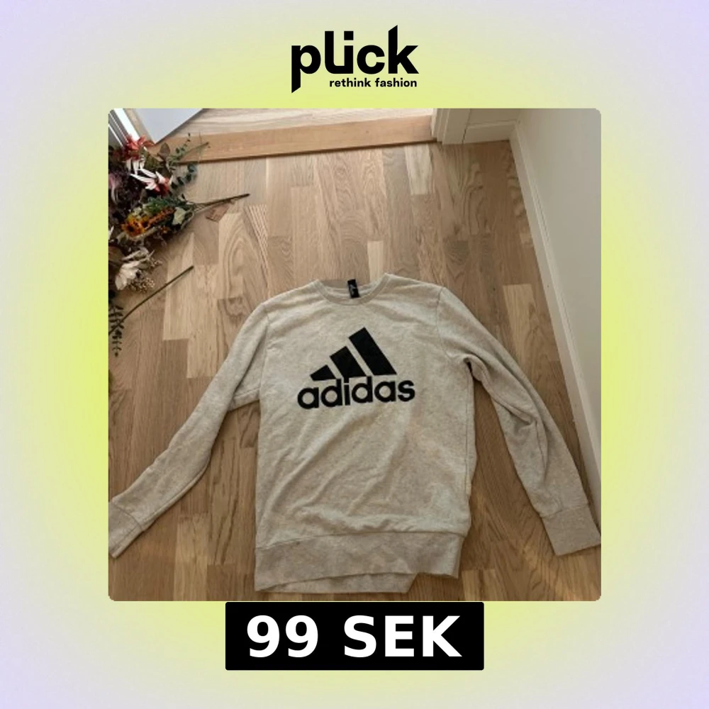 Säljer en beige sweatshirt från Adidas med klassisk svart logga framtill. Tröjan har rund halsringning och långa ärmar. Perfekt för en sportig och avslappnad stil. Materialet är mjukt och skönt, troligtvis bomullsmix.