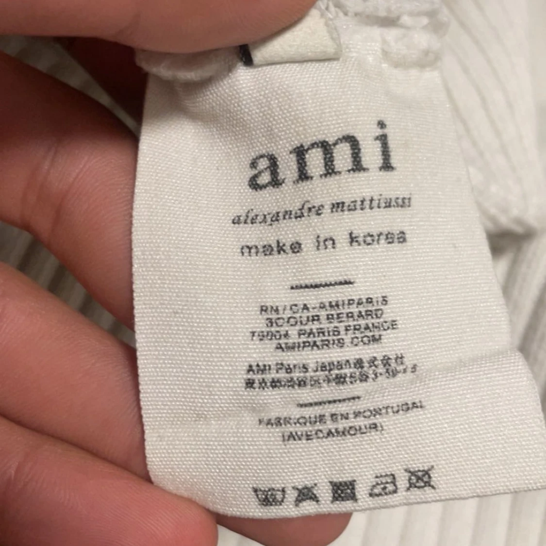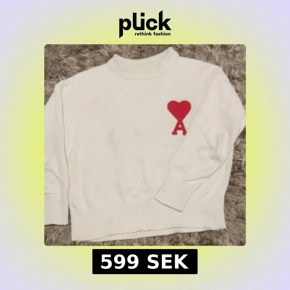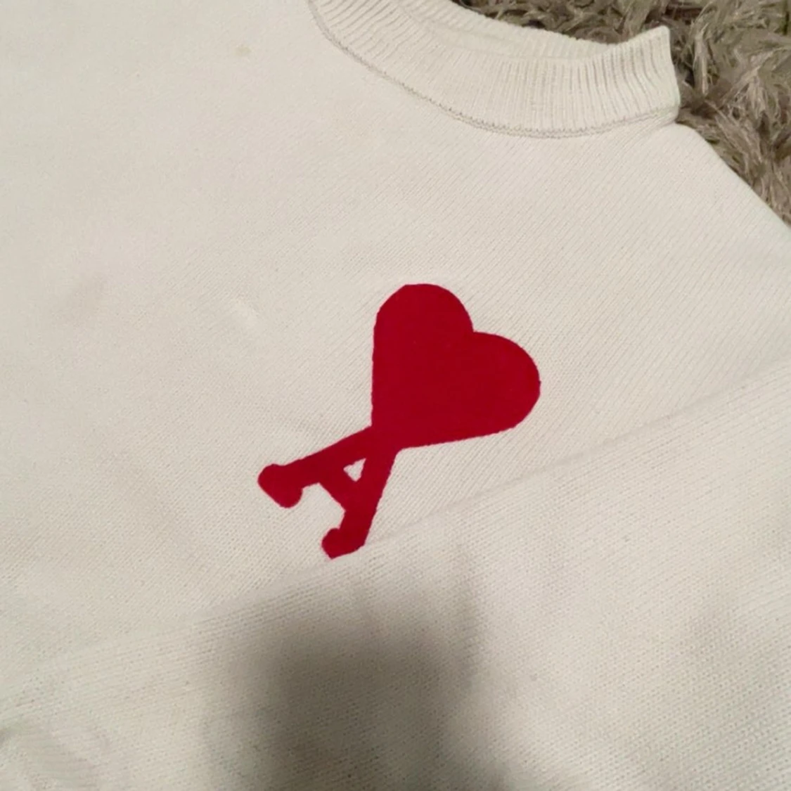 Vit stickad tröja från Ami Paris med röd hjärtlogga och bokstaven A på bröstet. Tröjan har ribbade muddar och en klassisk rund halsringning. Perfekt för dig som gillar stilrena plagg med en twist.