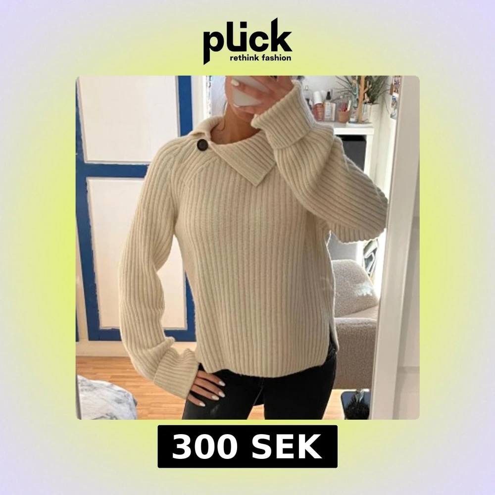 Säljer en mysig beige stickad tröja från Arket i lammullsmix. Tröjan har en unik krage med knappdetalj och långa ärmar. 💕💕 Är i fint skicka och knappast använt den!