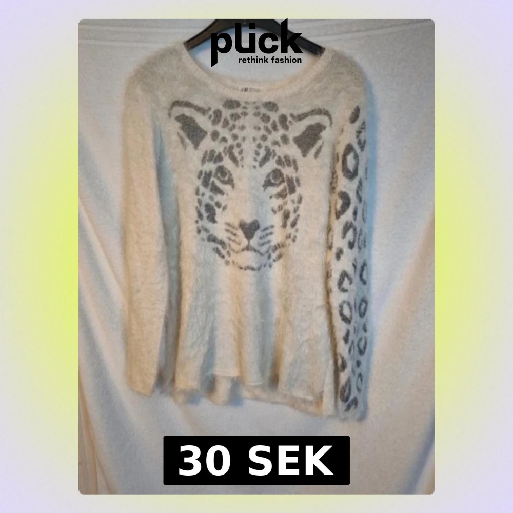 Vit stickad tröja med leopardmotiv som är lite lurvig. Storlek 158/164 från HM. Mycket fint skick.