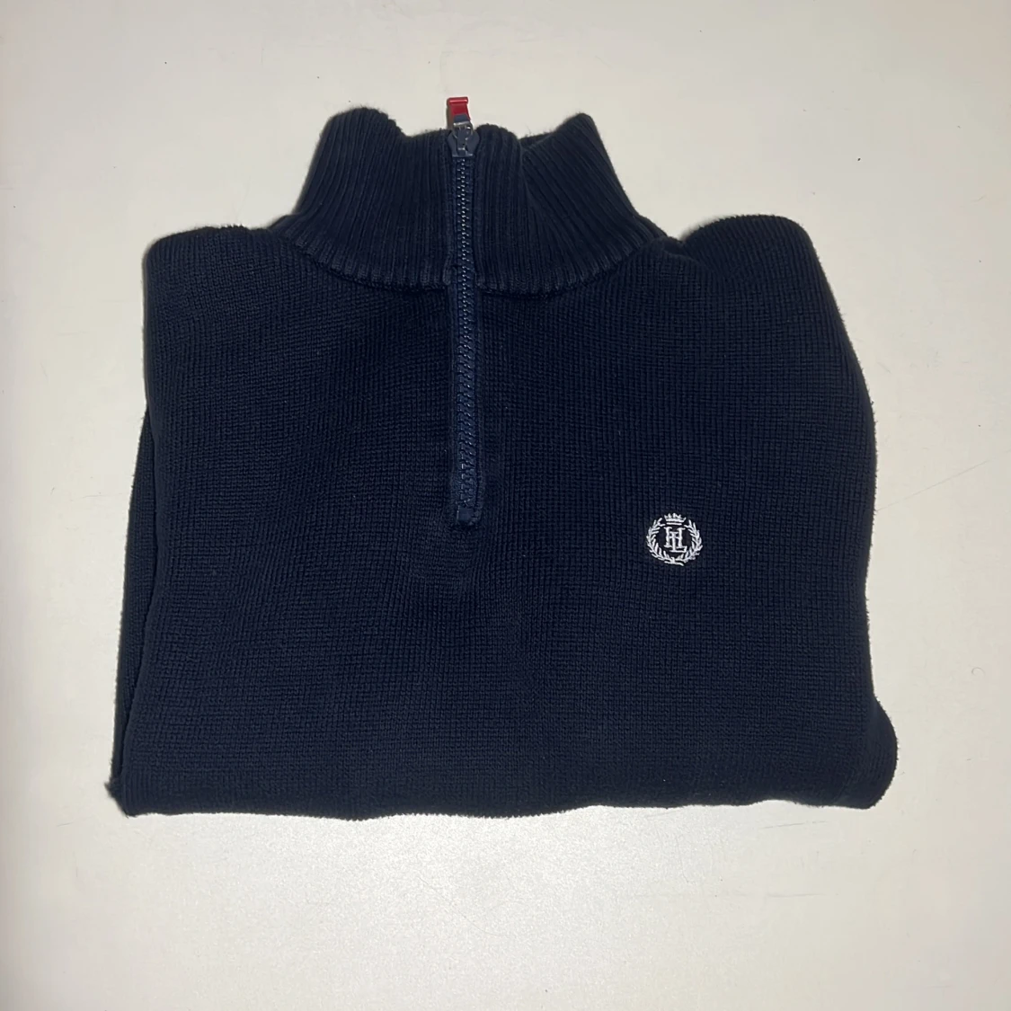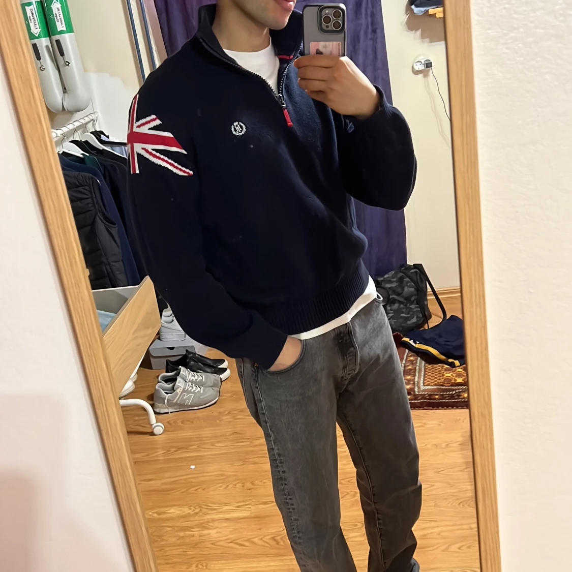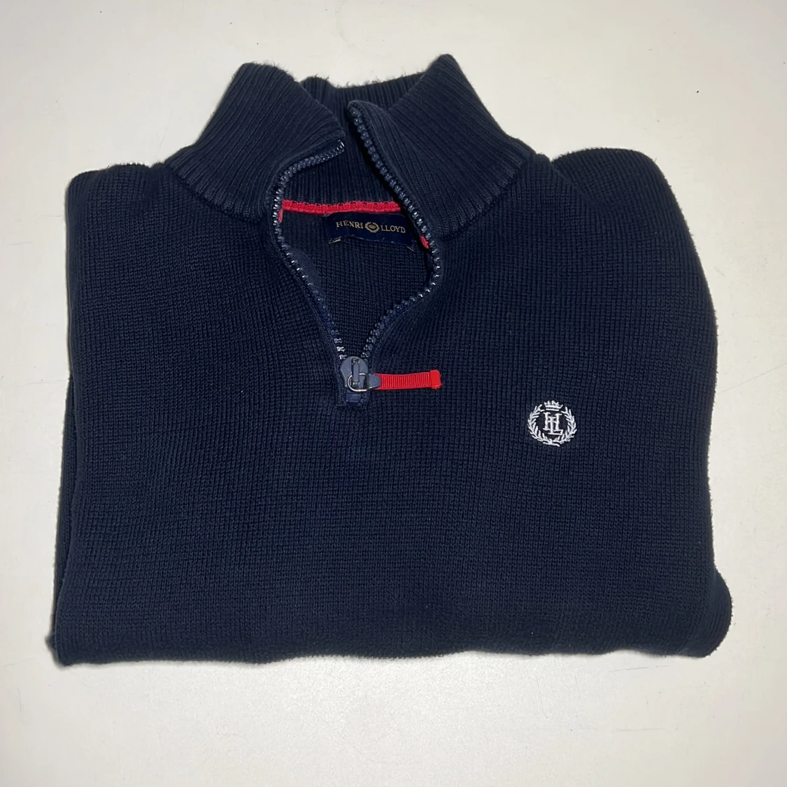 Henry Lloyd half zip stickad tröja. Otroligt fint kvalite och design. Har britiska flaggan på axeln. Är i bra, skulle säga minst 7/10. Nypris ca: hittar inte den men drygt 1000kr