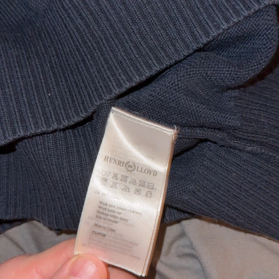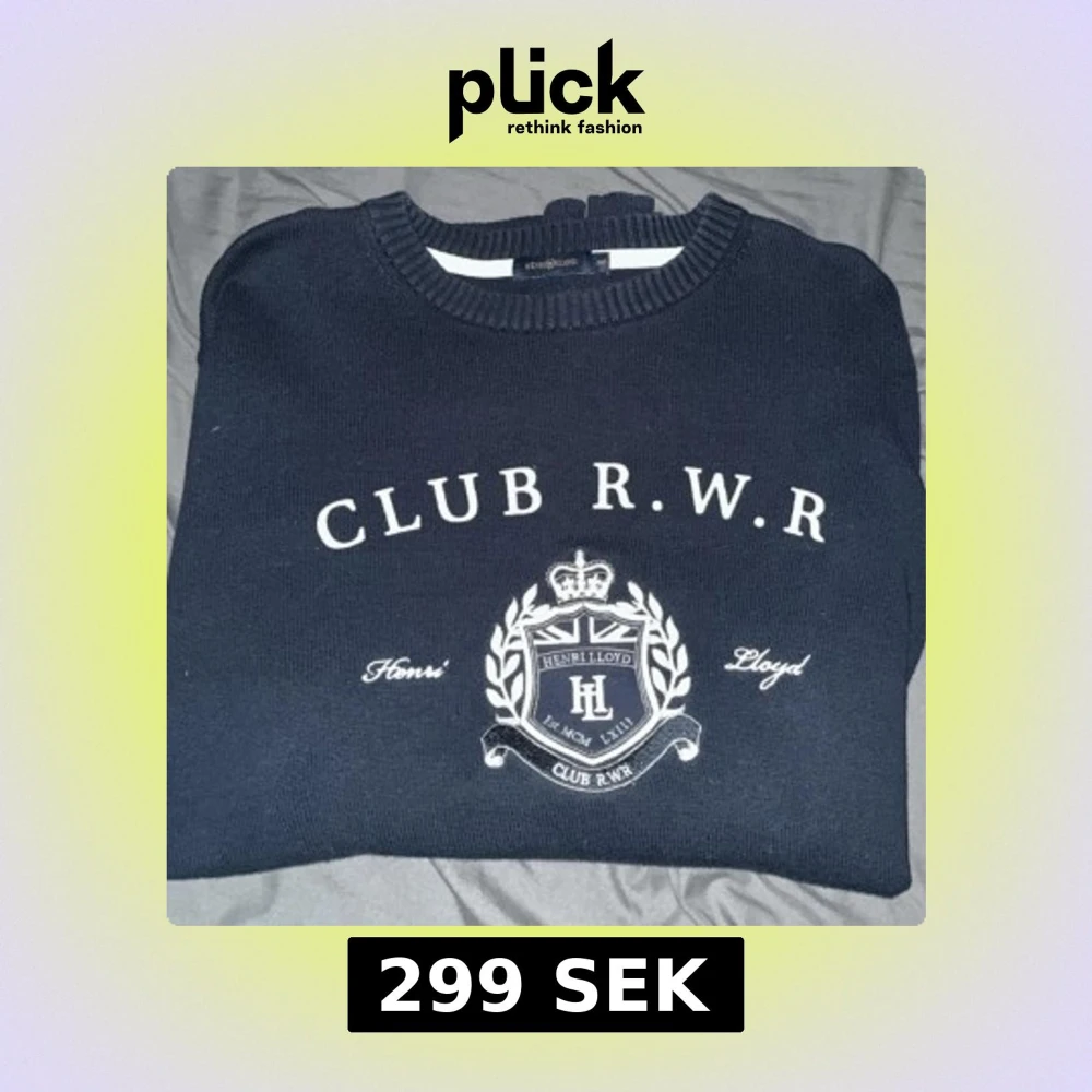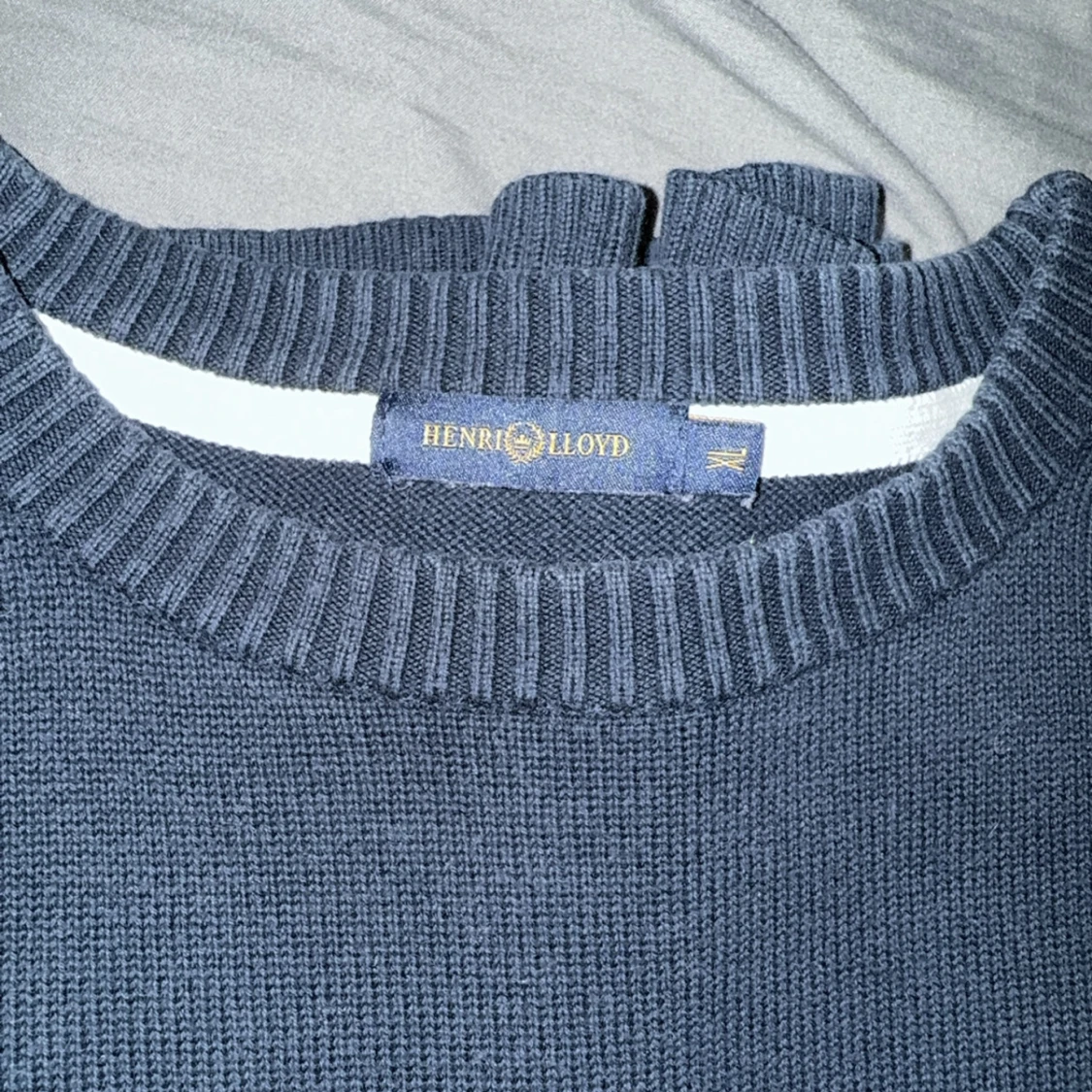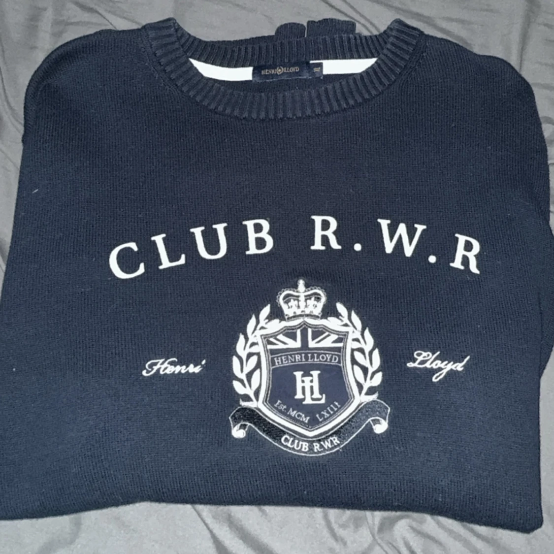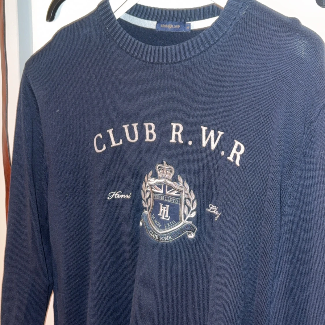 Mörkblå stickad tröja från Henri Lloyd med broderad Club R.W.R-logga och emblem på bröstet. Klassisk rund halsringning och ribbade muddar. Perfekt för dig som gillar preppy stil och snygga detaljer.och även lite lyxigare stil.