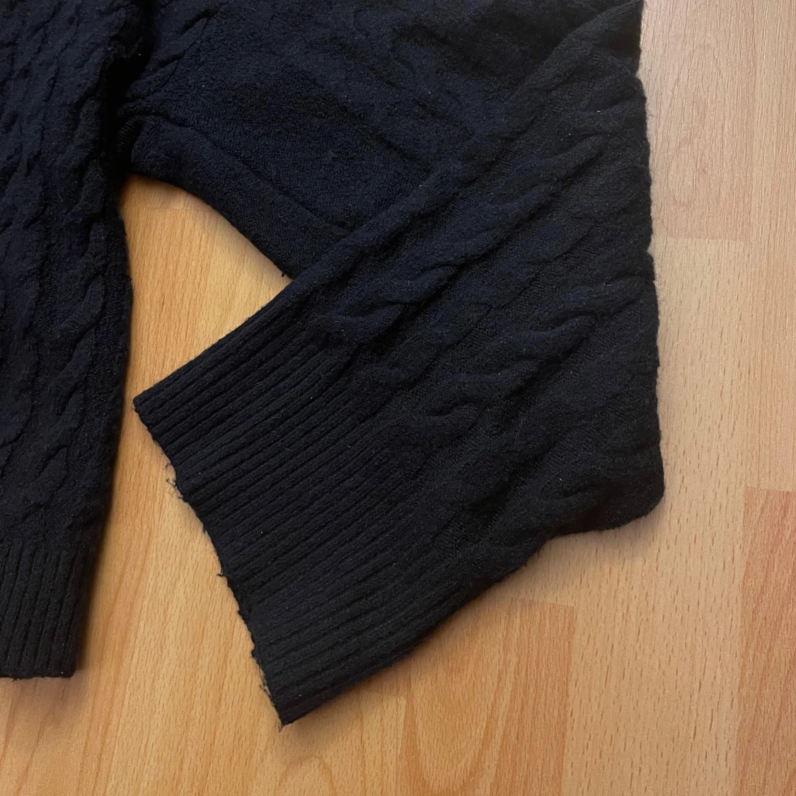 Mysig svart kabelstickad tröja med rund hals och långa ärmar. Tröjan har breda ribbade muddar vid ärmslut och nederkant, vilket ger en snygg och avslappnad look. Perfekt för dig som gillar klassisk stil med en twist.
