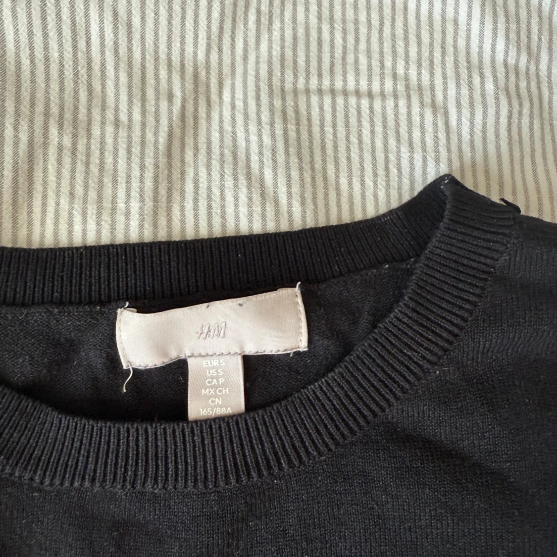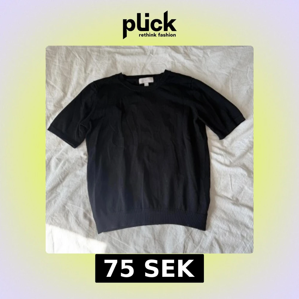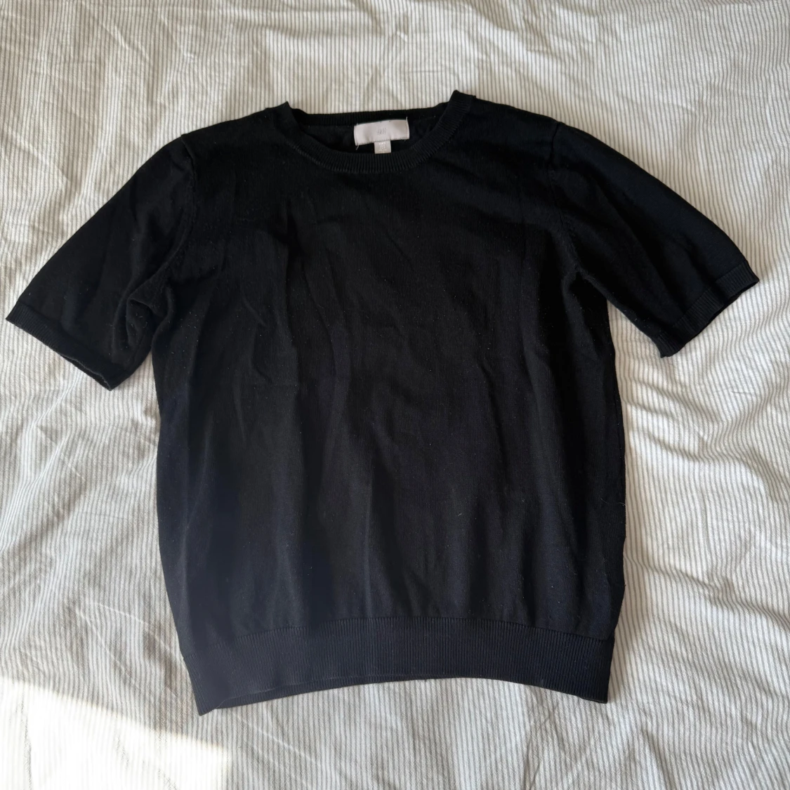 En enkel svart kortärmad tröja från H&M. Tröjan har rund halsringning och är tillverkad i ett mjukt material som passar perfekt till vardags. Klassisk och stilren design som är lätt att matcha med olika outfits.