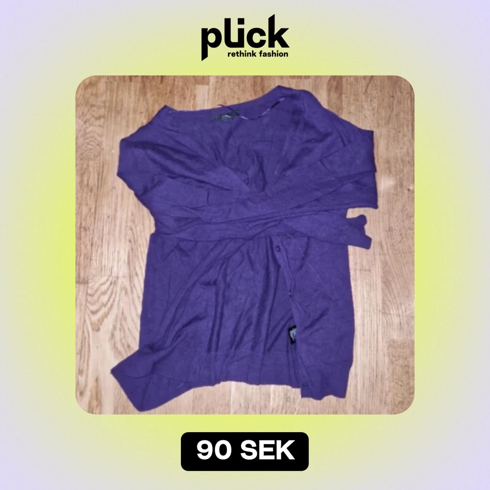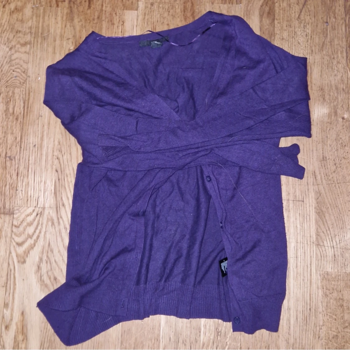 En lila kofta med långa ärmar och knappar framtill. Koftan har en enkel design och är tillverkad i ett mjukt material.