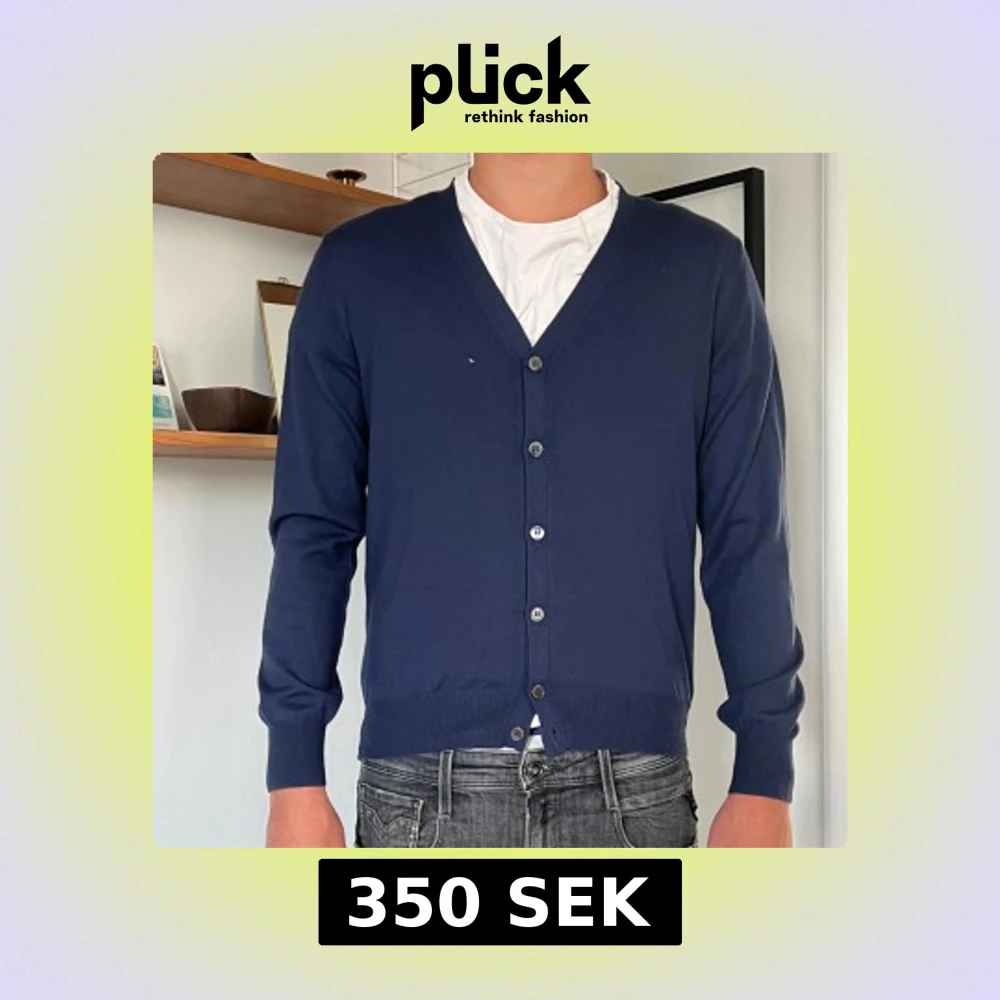 Snygg marinblå kofta/cardigan från Gran Sasso i virgin wool. Tillverkad i Italien. Det finns tyvärr ett litet hål på höger bröst som också syns i bilderna.