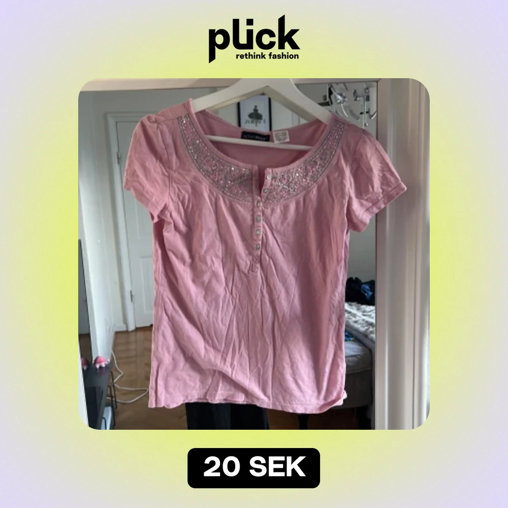 Tröjan är i väldigt bra skick och storlek 36 tror jag. Färgen är rosa väldigt fin ljus rosa. Den har glittriga detaljer.