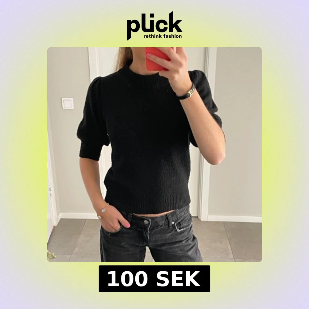 Säljer en svart stickad topp med rund hals och korta puffärmar. Modellen har ribbade kanter vid hals och nederkant. Perfekt för dig som gillar en enkel men trendig look.