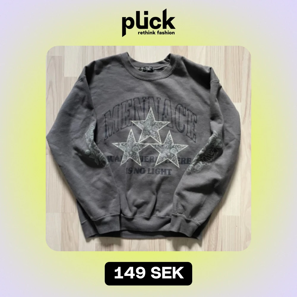 Mörk grå sweatshirt i storlek small. 50% bomull, 50% polyester blend. Stort svart och grått ”MENACE WALK THERE IS NO LIGHT” & ”tre grå stjärnor med mönster” tryck över hela framsidan. För mått/fler bilder skriv privat.