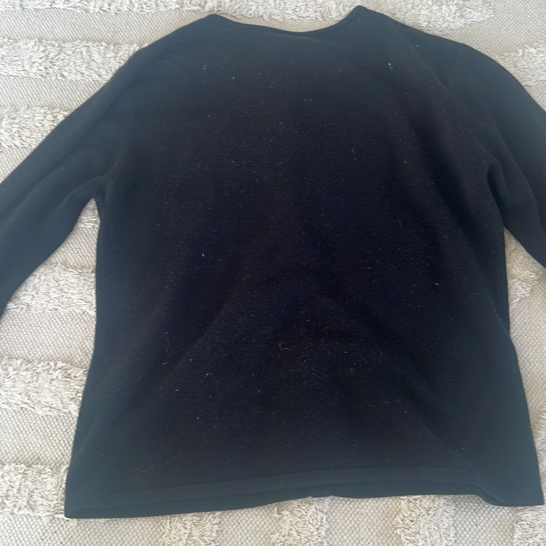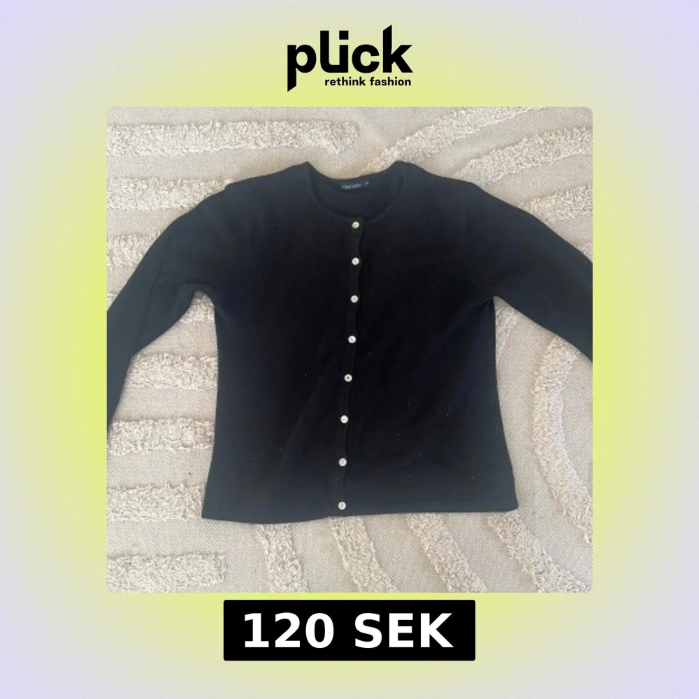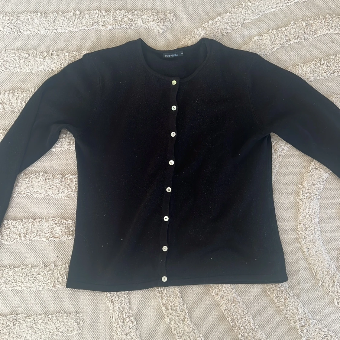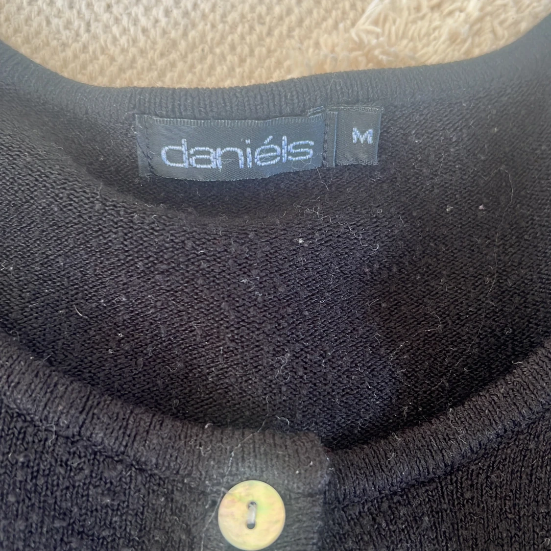En klassisk svart kofta från Daniels i storlek M. Koftan har rund halsringning, långa ärmar och vita knappar längs hela framsidan.