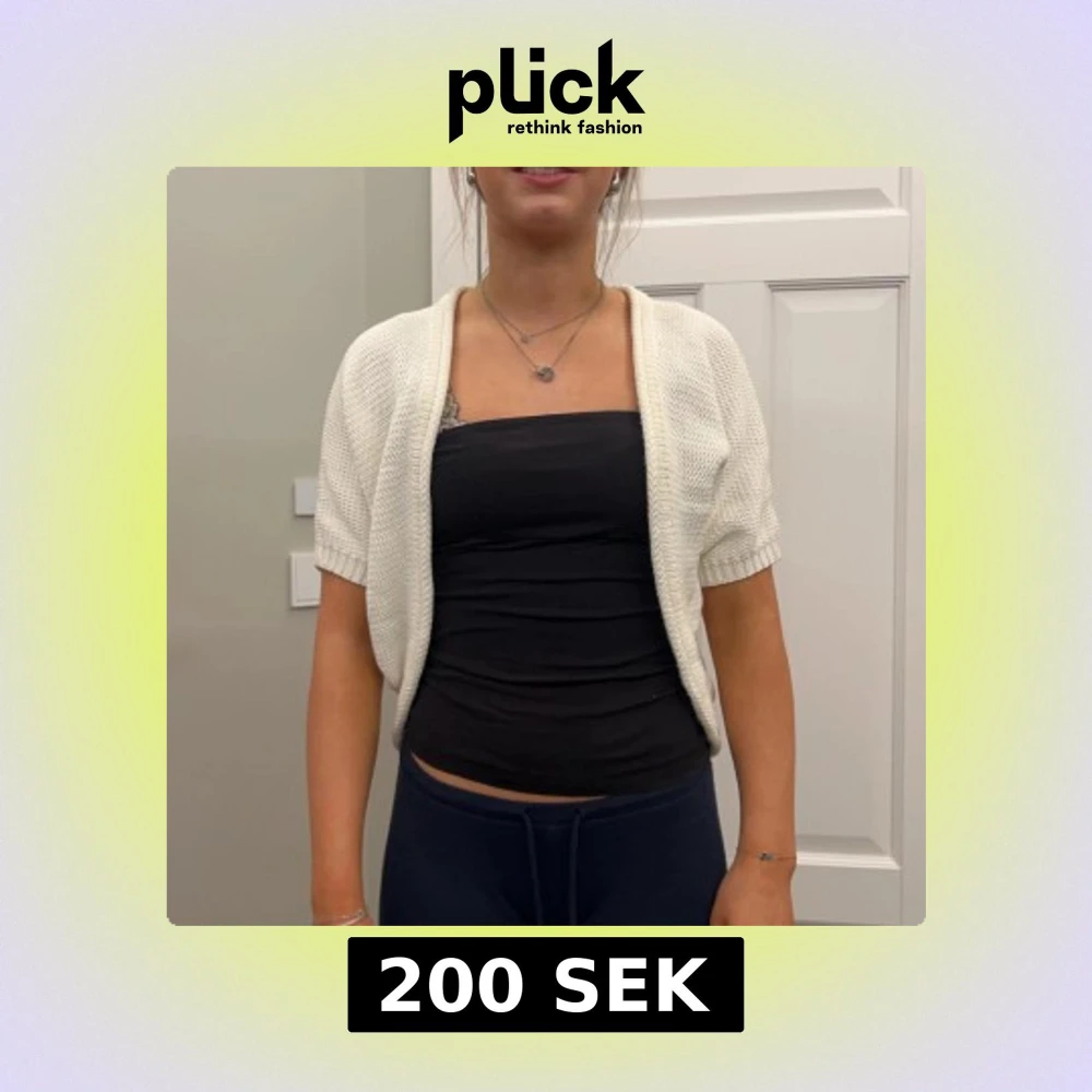 Säljer en söt vit stickad bolerotopp med korta ärmar. Perfekt för att lägga till en extra touch till din outfit. Passar bra över en klänning eller topp.