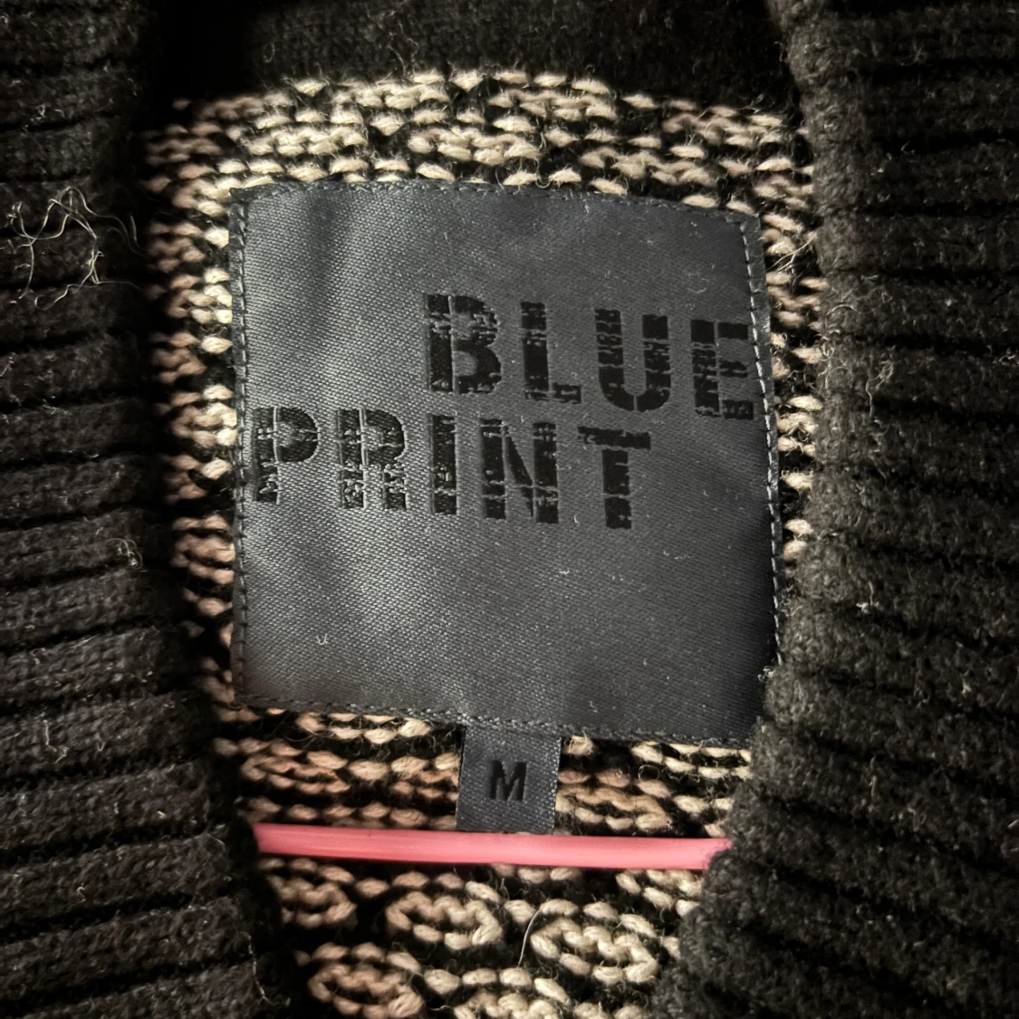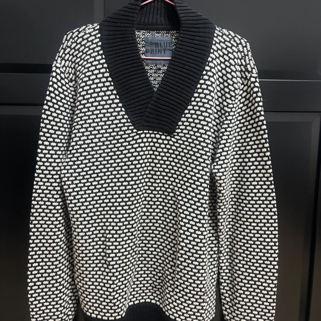 Säljer en svartvit stickad tröja från Blue Print med coolt mönster och bred ribbad krage. Tröjan har lång ärm och är perfekt för dig som gillar en unik och stilren look.