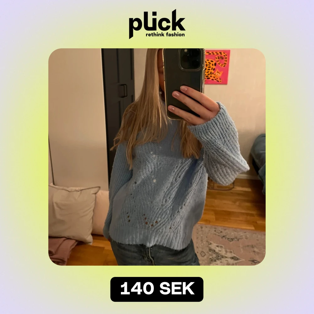 Supermysig ljusblå stickad tröja, perfekt nu i vinter!! Hålstickad, utan defekter, men lite nopprig💙💙