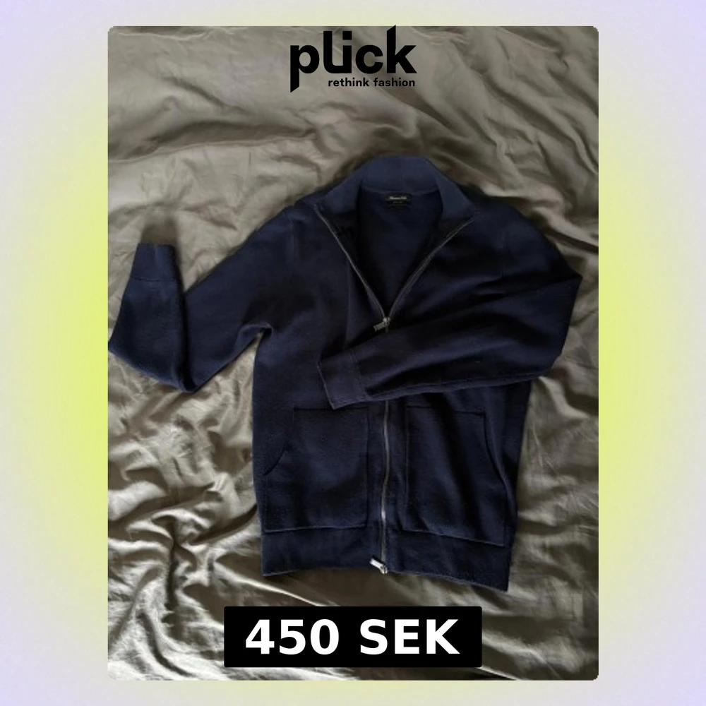 Snygg marinblå kofta från Massimo Dutti med hel dragkedja och ribbade muddar. Tröjan har två praktiska fickor framtill och en klassisk krage. Materialet är mjukt och stickat, perfekt för kyliga dagar. Passar dig som gillar stilrena och enkla plagg.