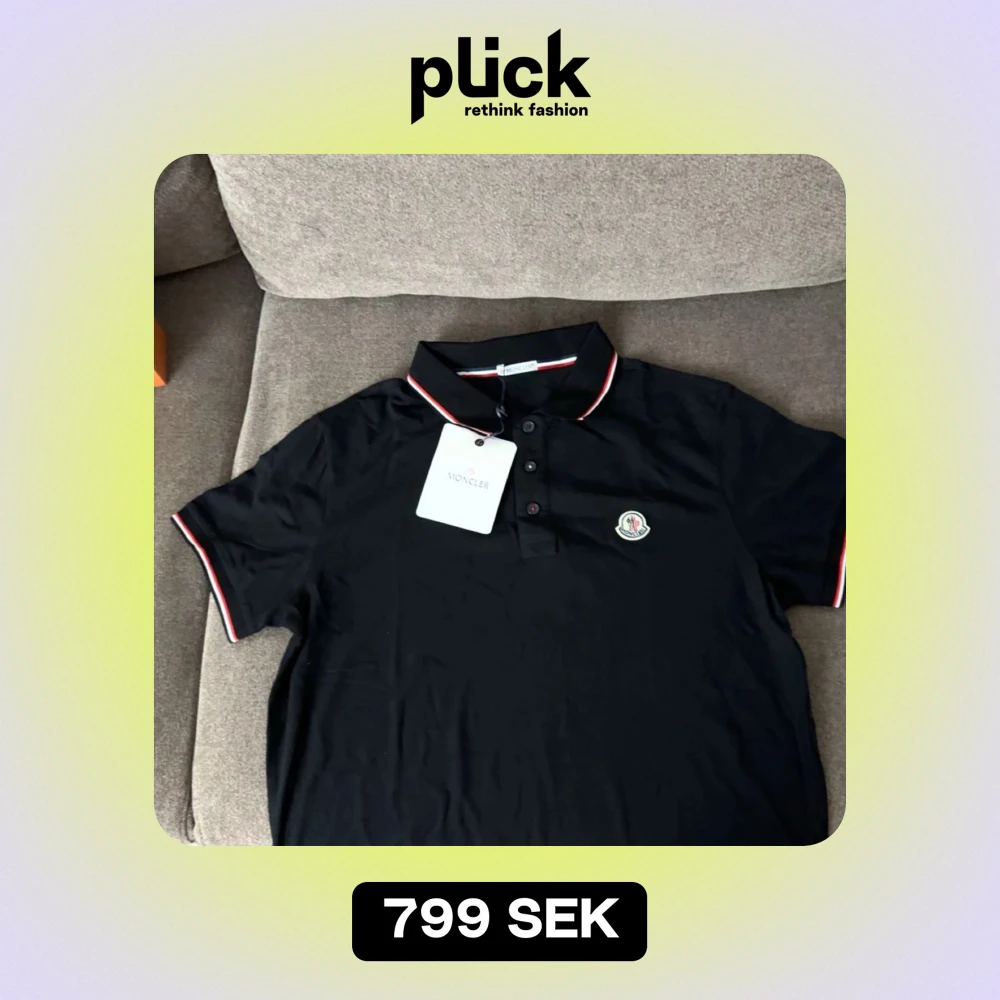 Säljer en snygg svart pikétröja från Moncler i nytt skick. Den har en klassisk krage med röd och vit kant samt Monclers logga på bröstet. Perfekt för både vardag och fest! 🖤