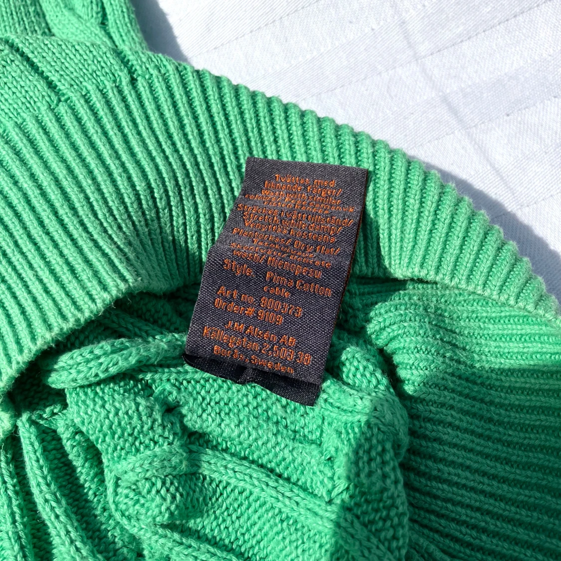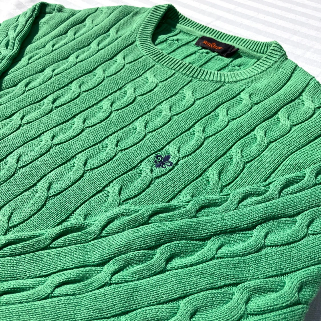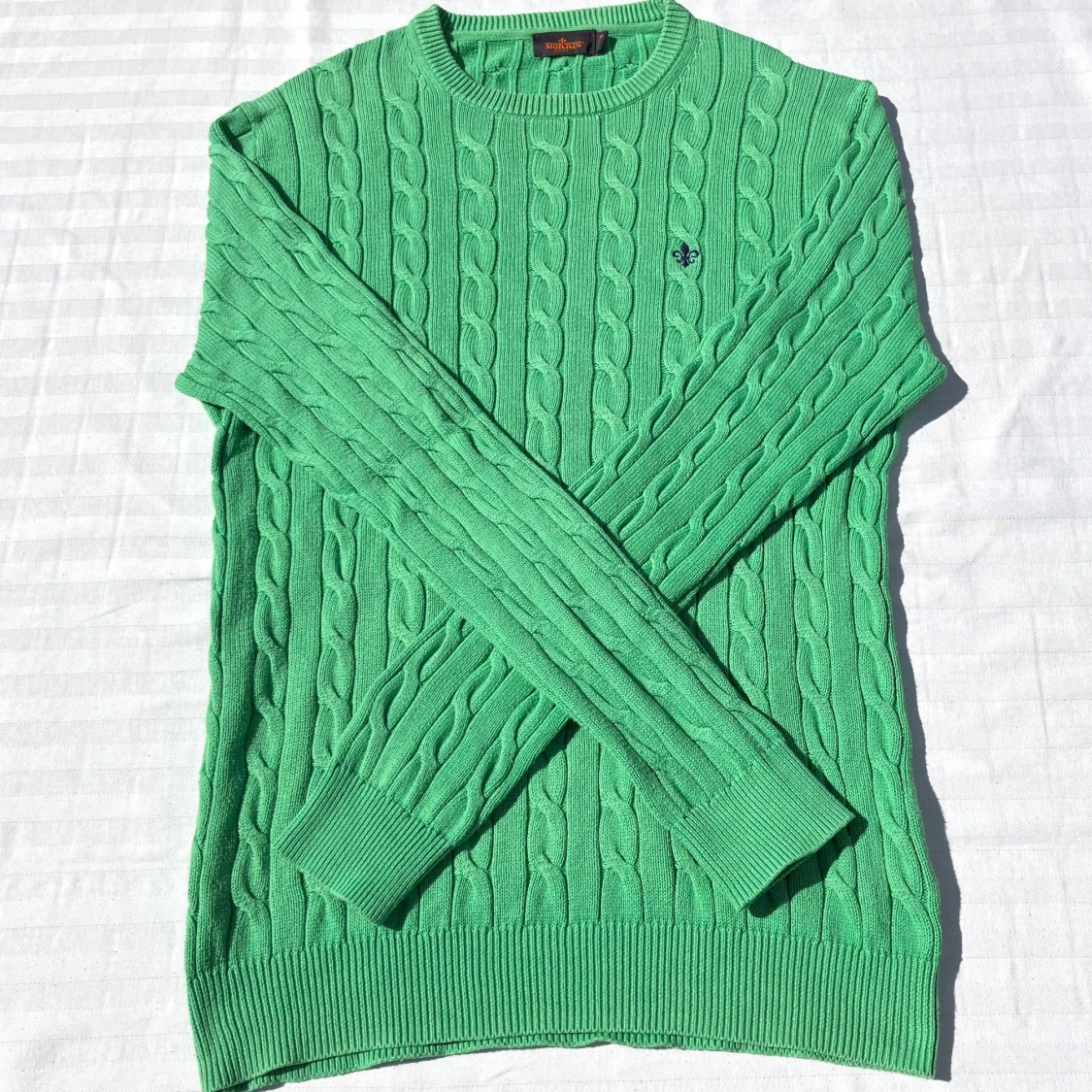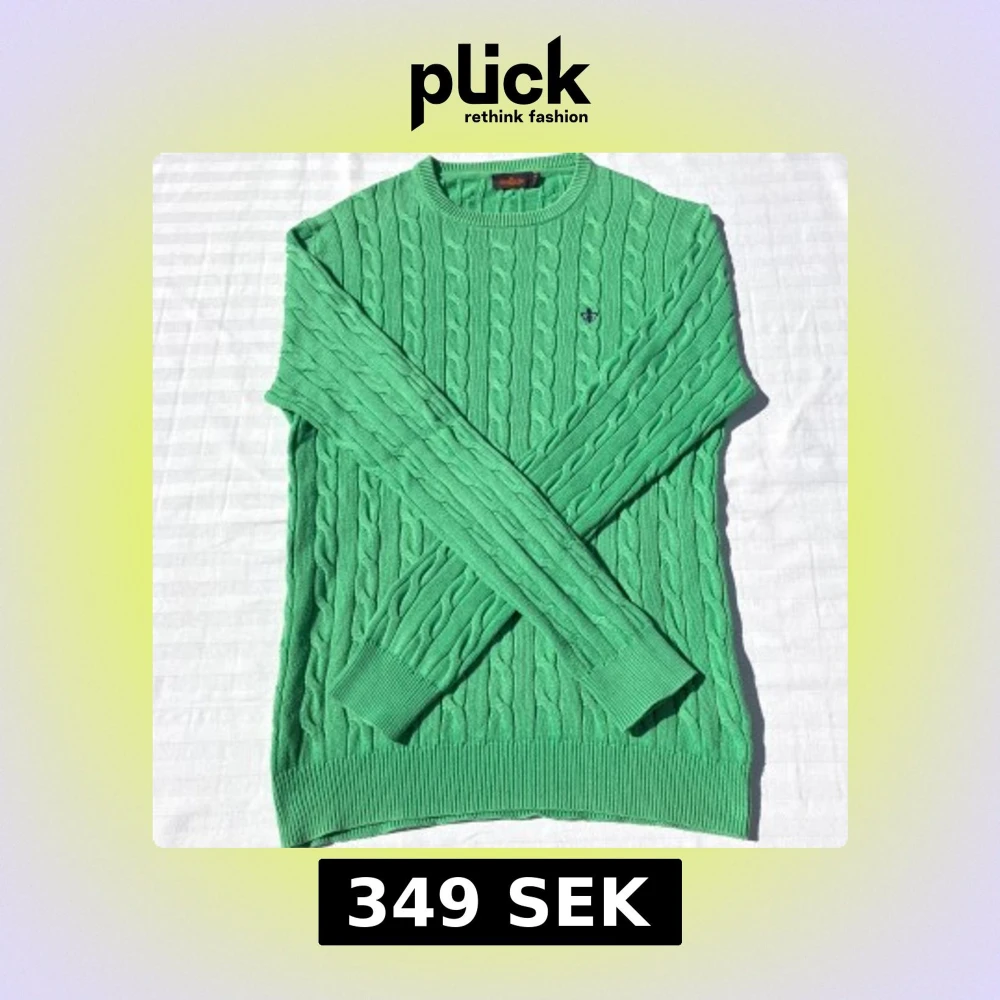 Snygg grön kabelstickad tröja från Morris i storlek M och 100% pima bomull. Tröjan har rund halsringning, ribbade muddar och ett broderat emblem på bröstet. Perfekt för dig som gillar klassisk stil med en twist av färg. Tröjan är i mycket bra skick och har endast används 3-5 gånger utan några fläckar eller imperfektioner.