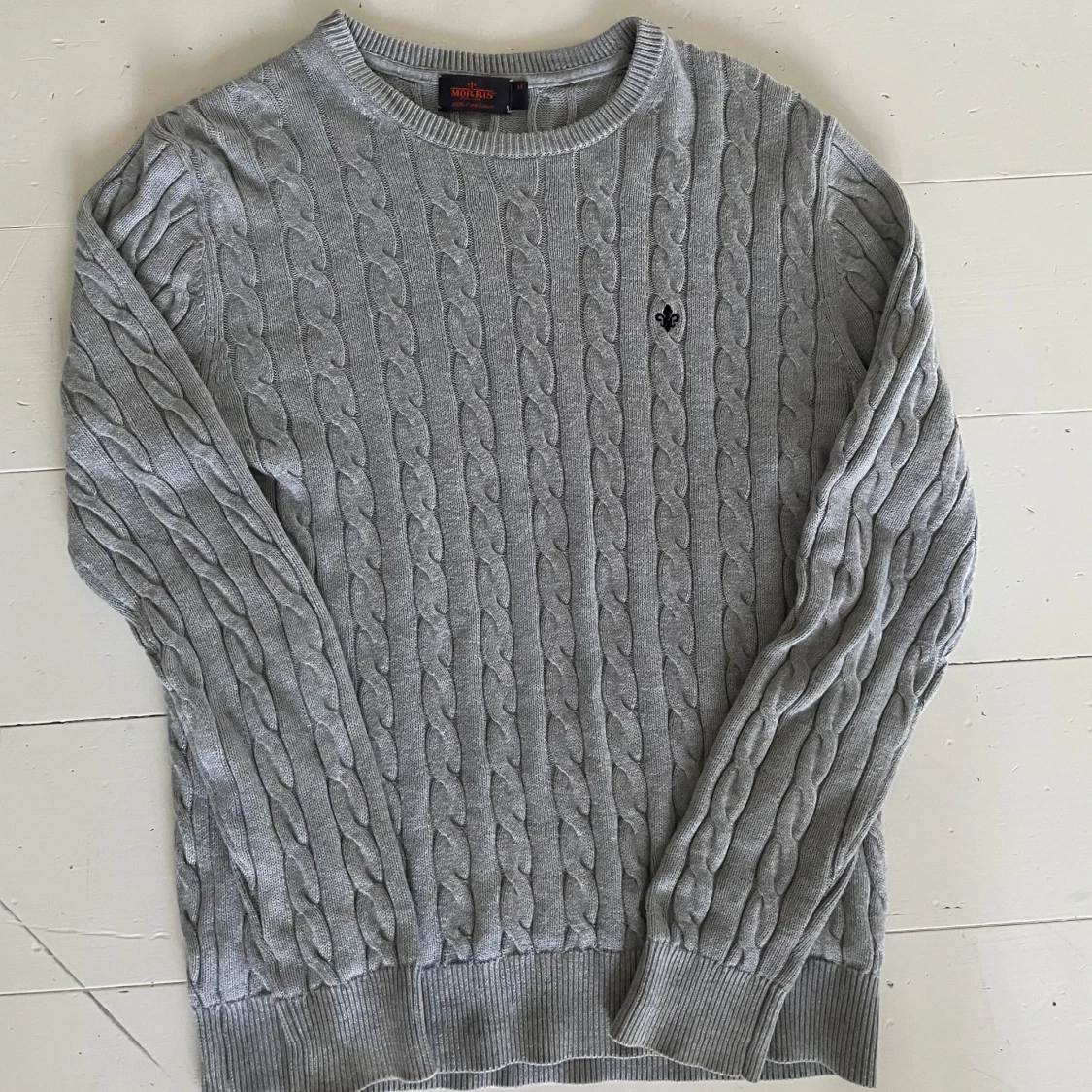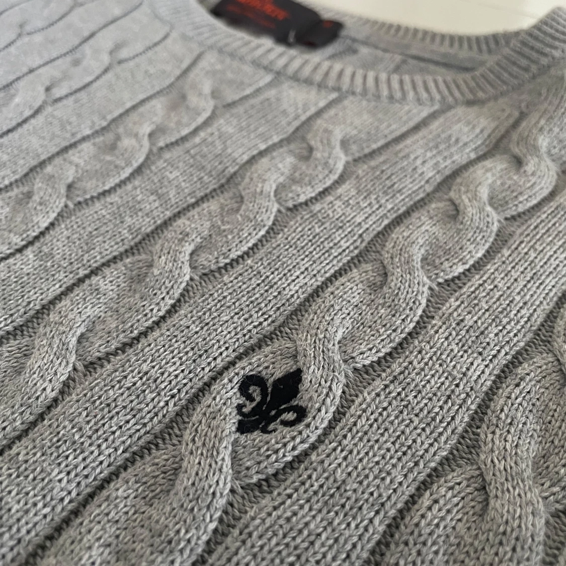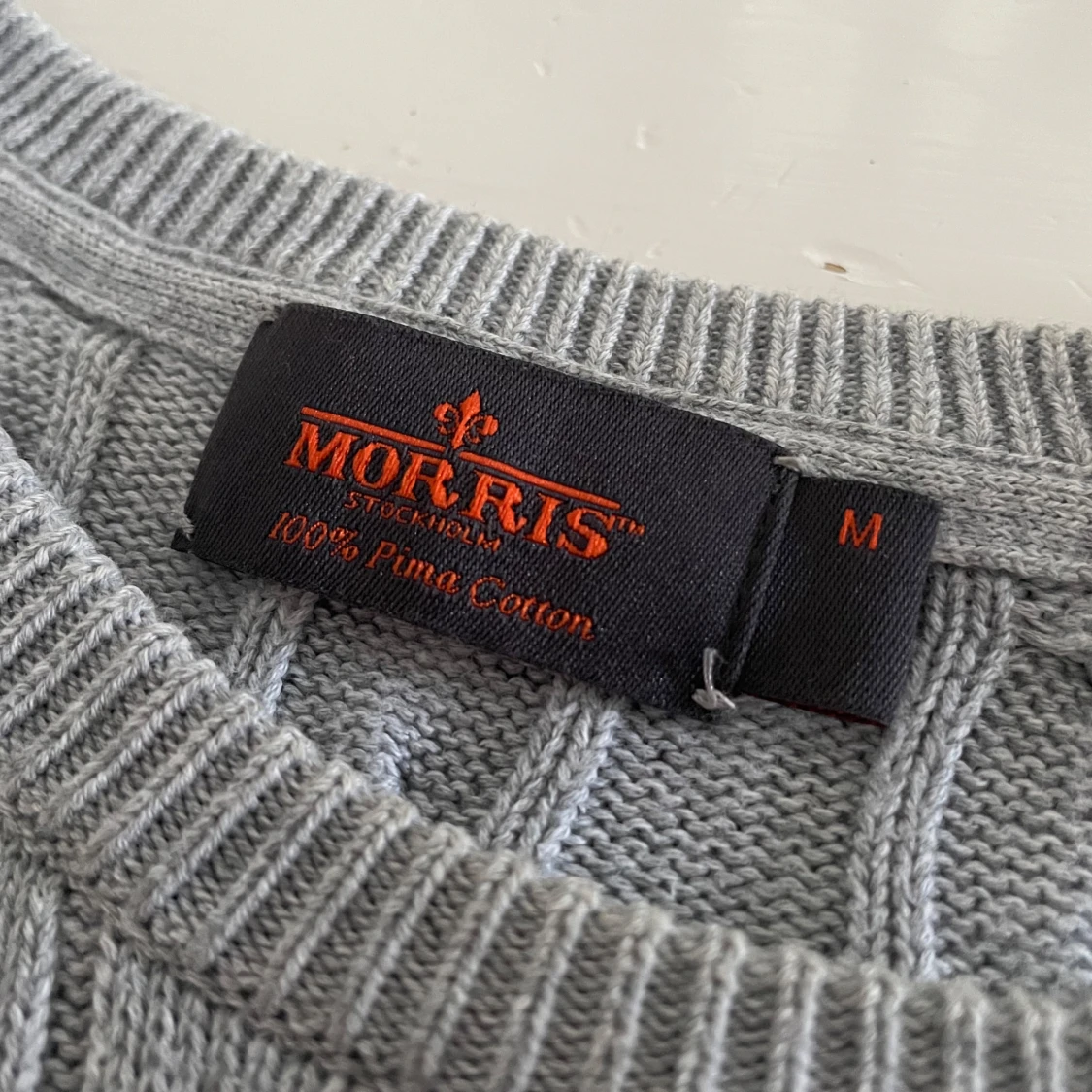 En nästan helt oavänd snygg grå kabelstickad tröja från Morris i 100% pima bomull. Klassisk modell med rund halsringning, ribbade muddar och diskret svart brodyr på bröstet. Perfekt nu till hösten🍁🍂
