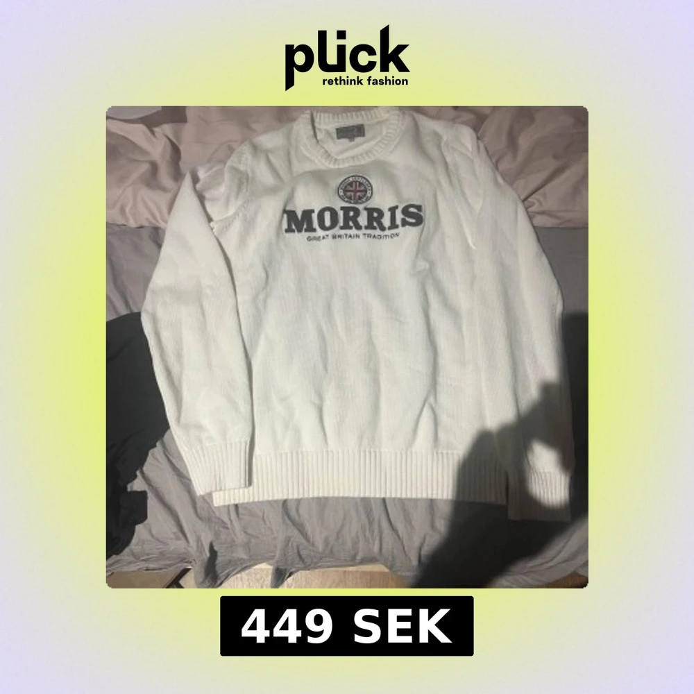 Vit stickad tröja från Morris med rund halsringning och ribbade muddar. Stor broderad Morris-logga och brittisk flagga framtill ger en klassisk och sportig vibe. Perfekt för dig som gillar stilrena och tidlösa plagg med snygga detaljer. Tröjan är i storlek M men kan även passa S, DM för fler frågor!