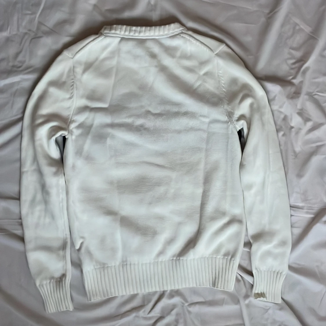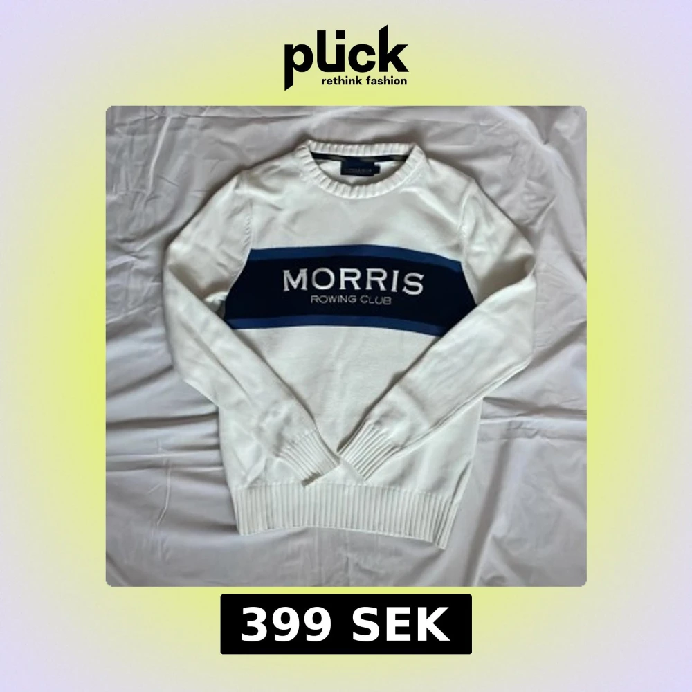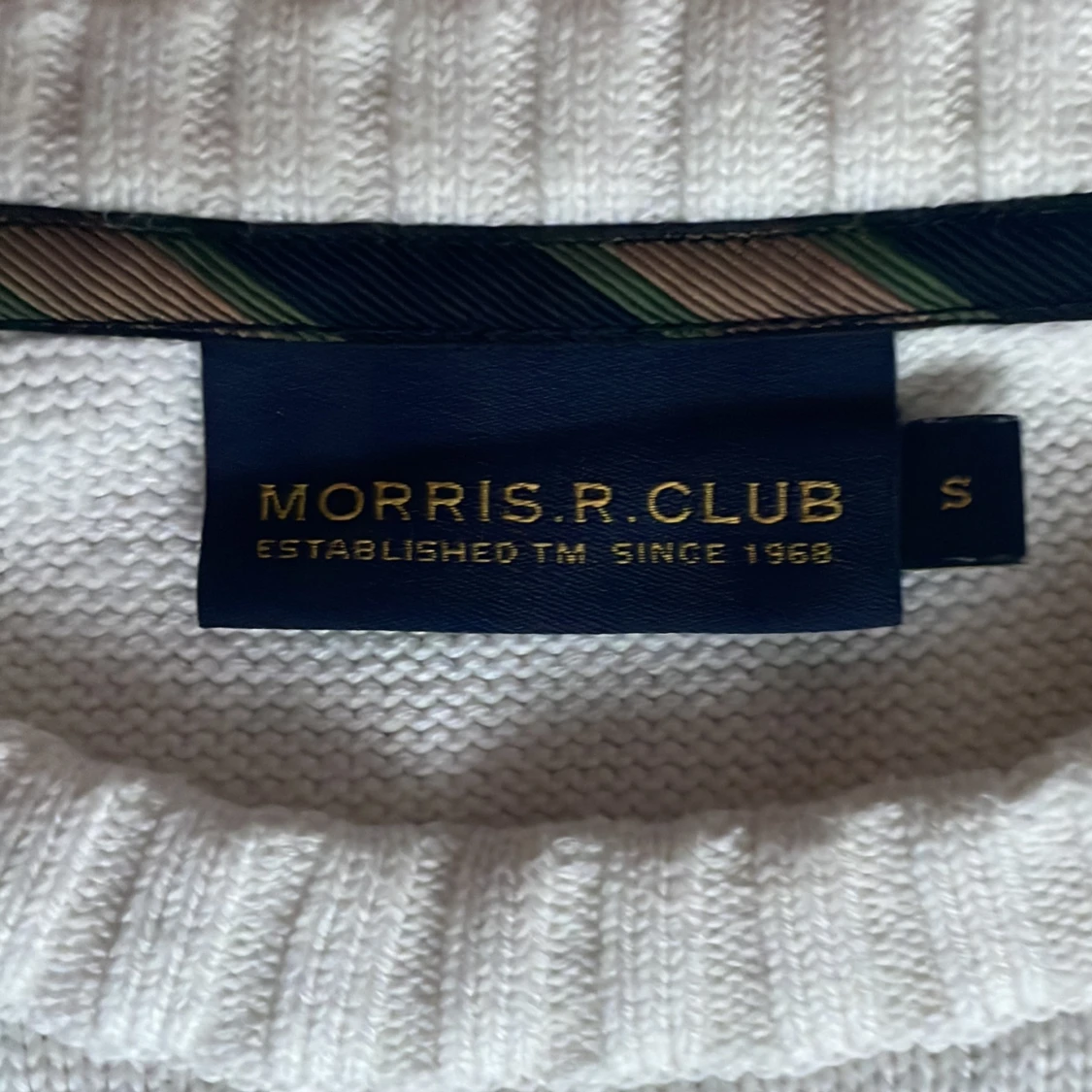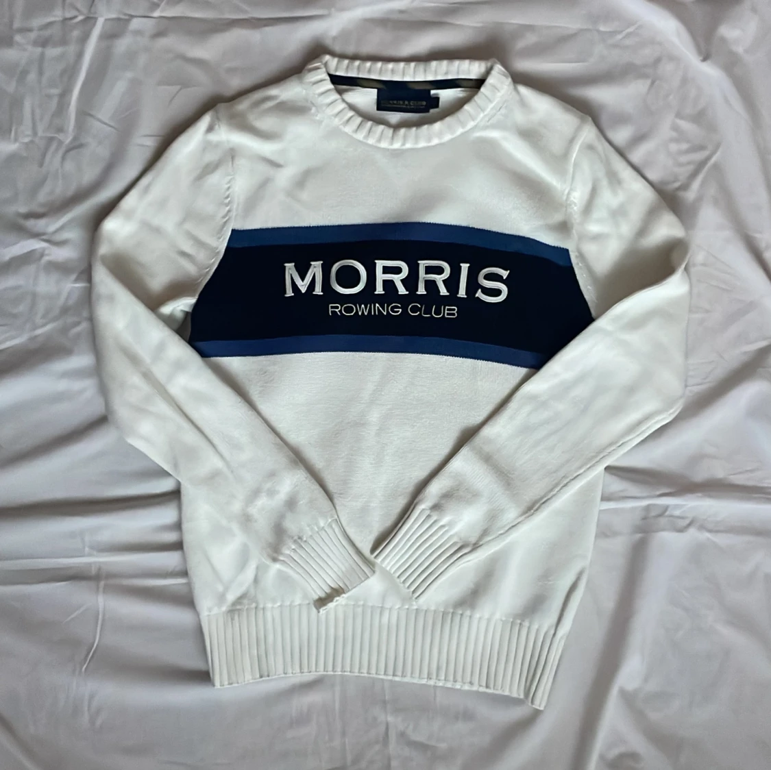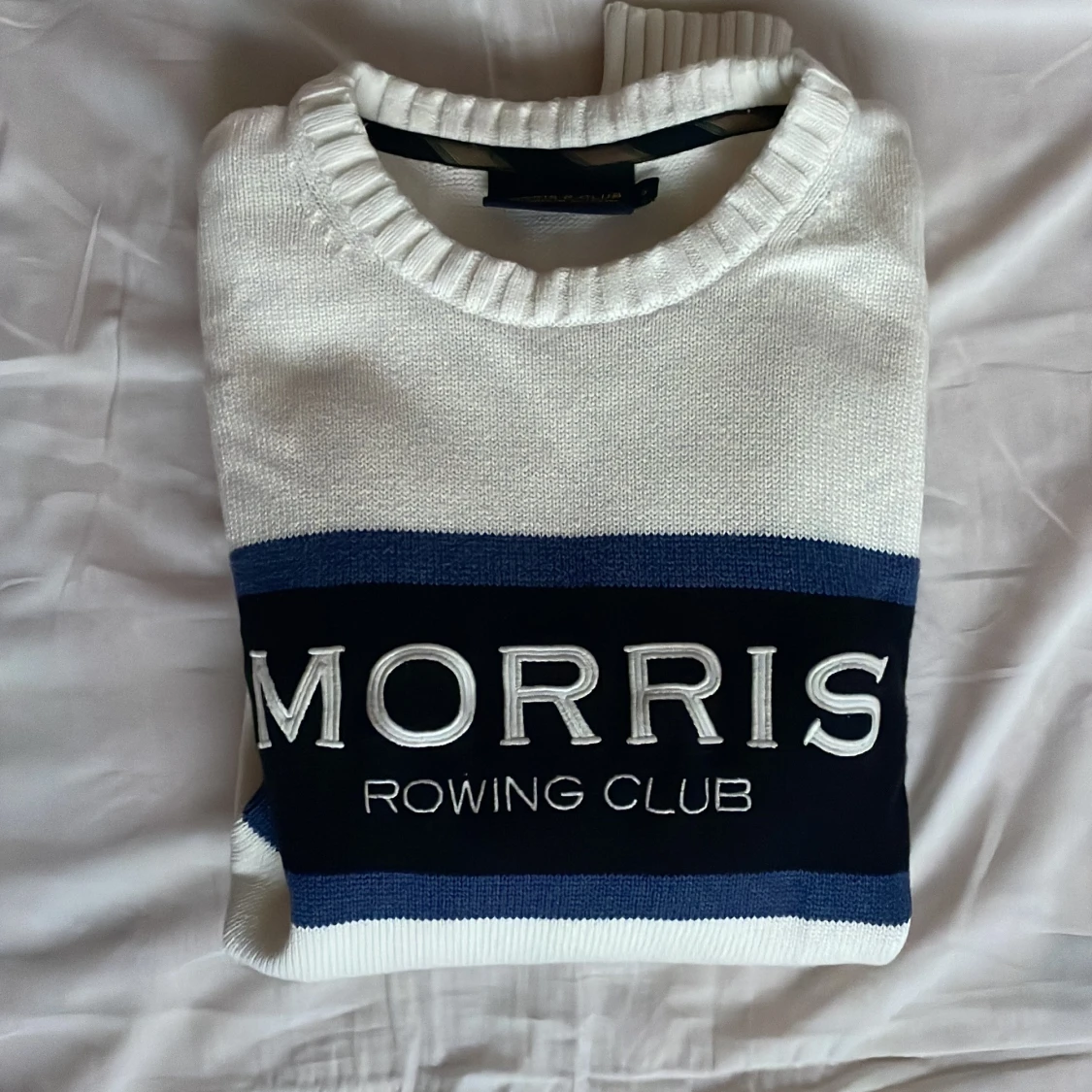 Vit stickad tröja från Morris Rowing Club med blått och mörkblått band över bröstet och broderad logga. Rund halsringning och ribbade muddar vid ärmslut och nederkant. Perfekt för en stilren och sportig look.