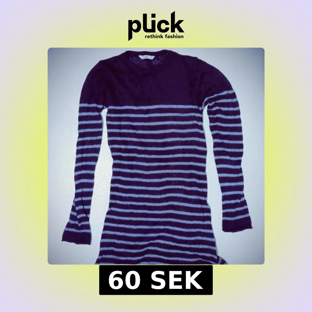 Stickad lång tröja med mörklila och ljuslila ränder. Den har långa ärmar och en bekväm passform som passar perfekt för kyligare dagar.