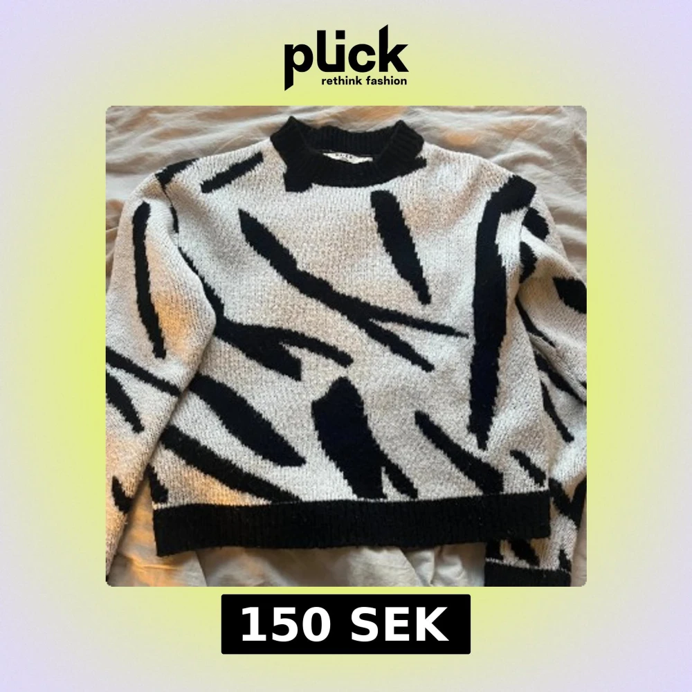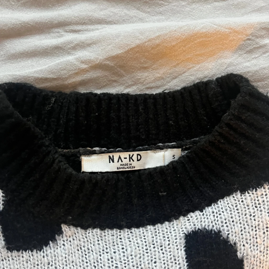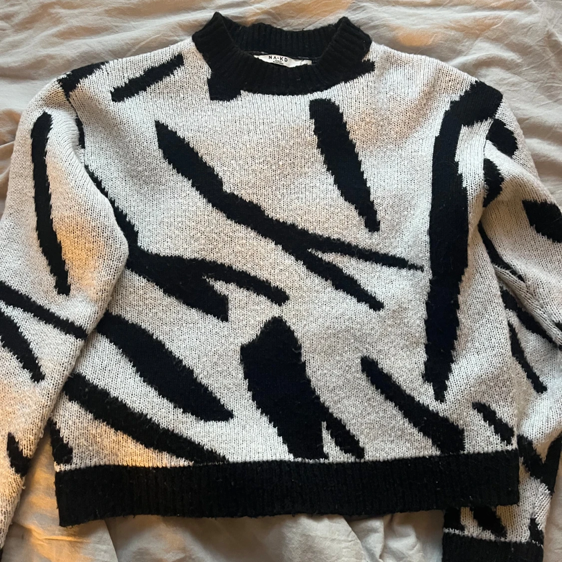 Säljer en cool svartvit tröja från NA-KD med ett djärvt mönster. Tröjan har långa ärmar och en rund halsringning.