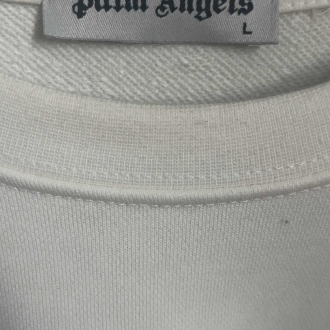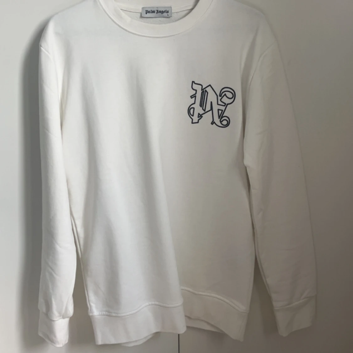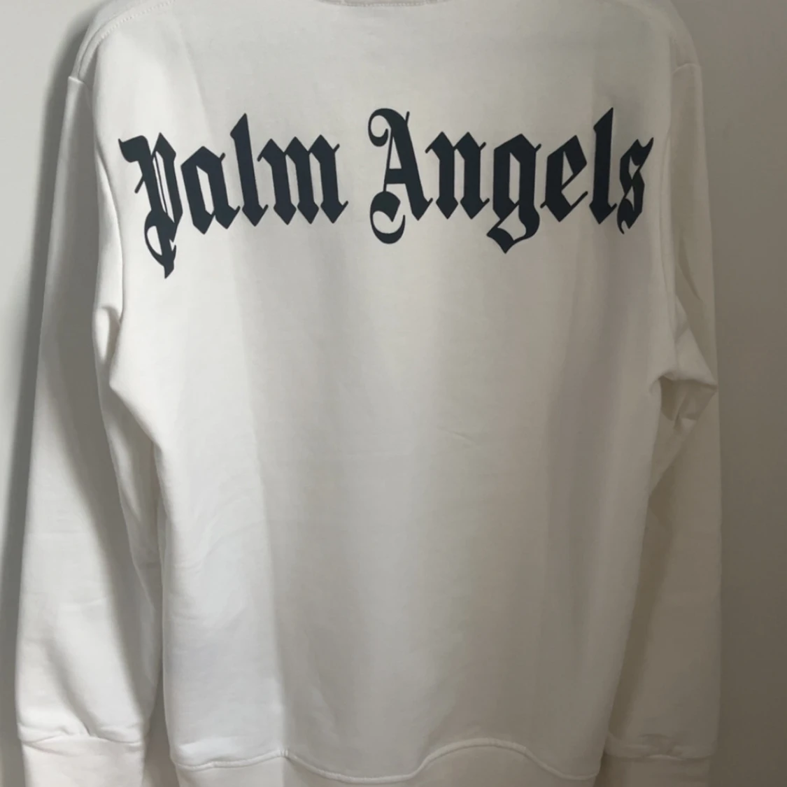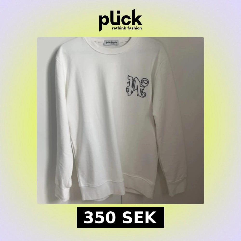 Säljer en vit sweatshirt från Palm Angels med svart tryck på bröstet och stor logga på ryggen. Tröjan har rund halsringning och långa ärmar. Perfekt för dig som gillar streetwear och vill sticka ut med en snygg logga.storlek L men sitter rätt så slim. Tröjan är inte äkta