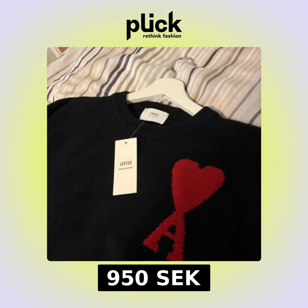 Säljer en svart stickad tröja från Ami med ett rött hjärta och bokstaven A broderat på bröstet. Tröjan har rund halsringning och långa ärmar. Pris går att diskutera så det är bara att skriva