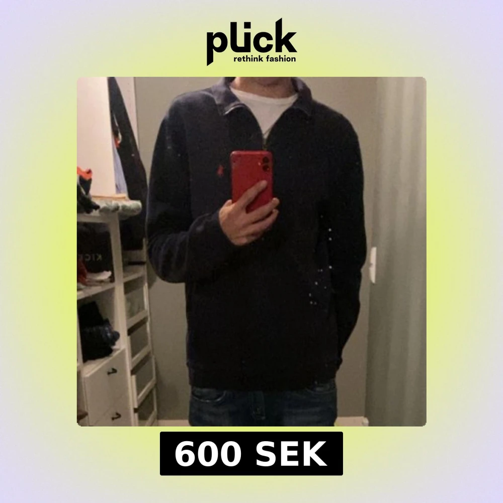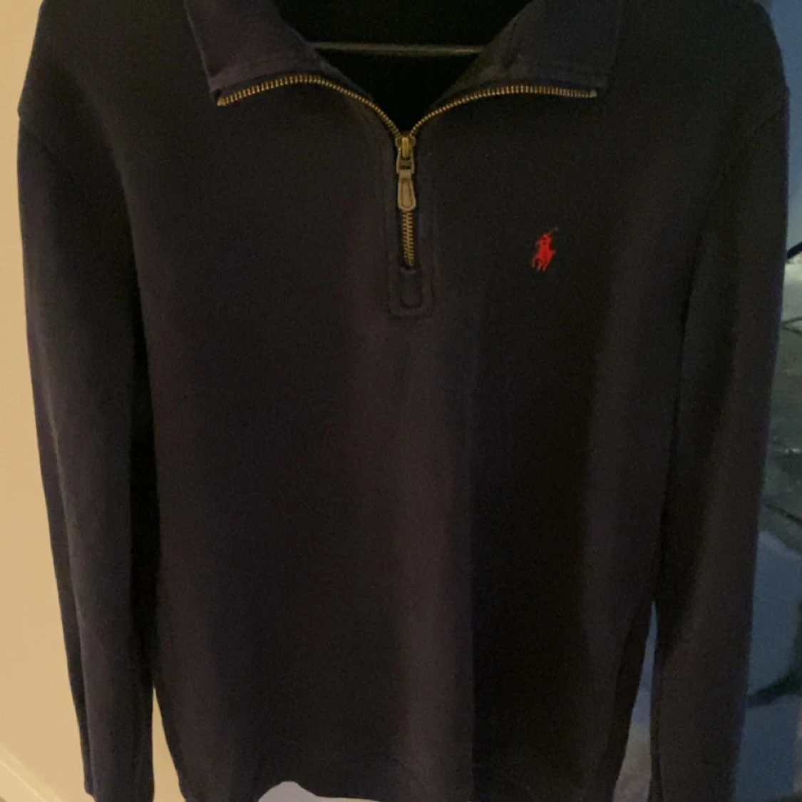 Säljer en mörkblå långärmad tröja från Polo Ralph Lauren med half zip och klassisk krage. Tröjan har röd broderad logga på bröstet och är i mjuk bomull. Perfekt för dig som gillar stilren och enkel design.