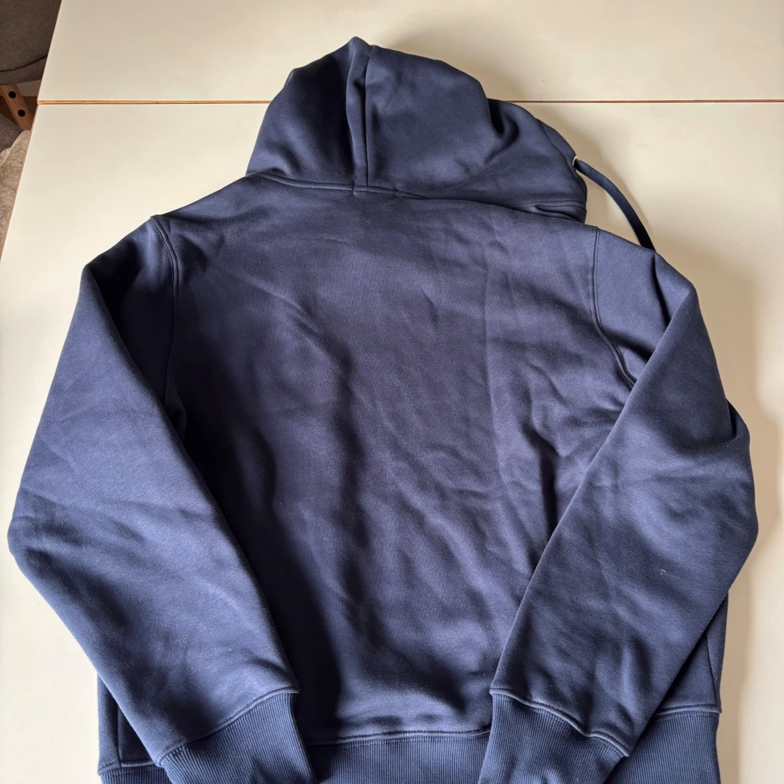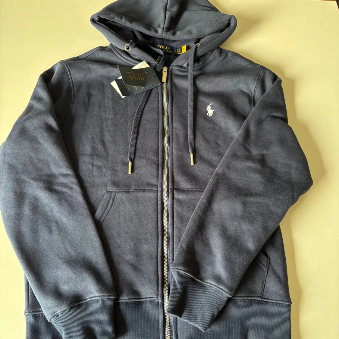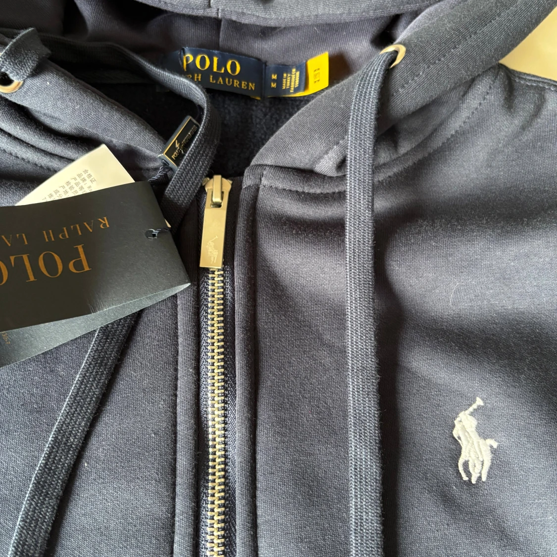 Snygg mörkblå hoodie från Polo Ralph Lauren med klassisk logga broderad på bröstet. Tröjan har huva med snörning, dragkedja framtill och två fickor. Insidan är mjuk fleece och materialet är bomull och polyester. Perfekt för chill dagar och streetwear. Sitter mer som S men kan även passa M beroende på. Priset är ej hugget i sten.