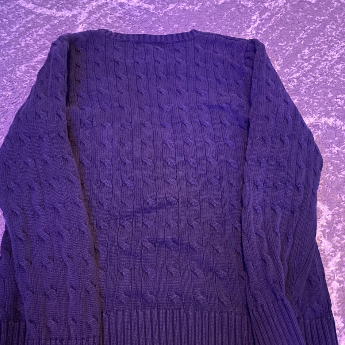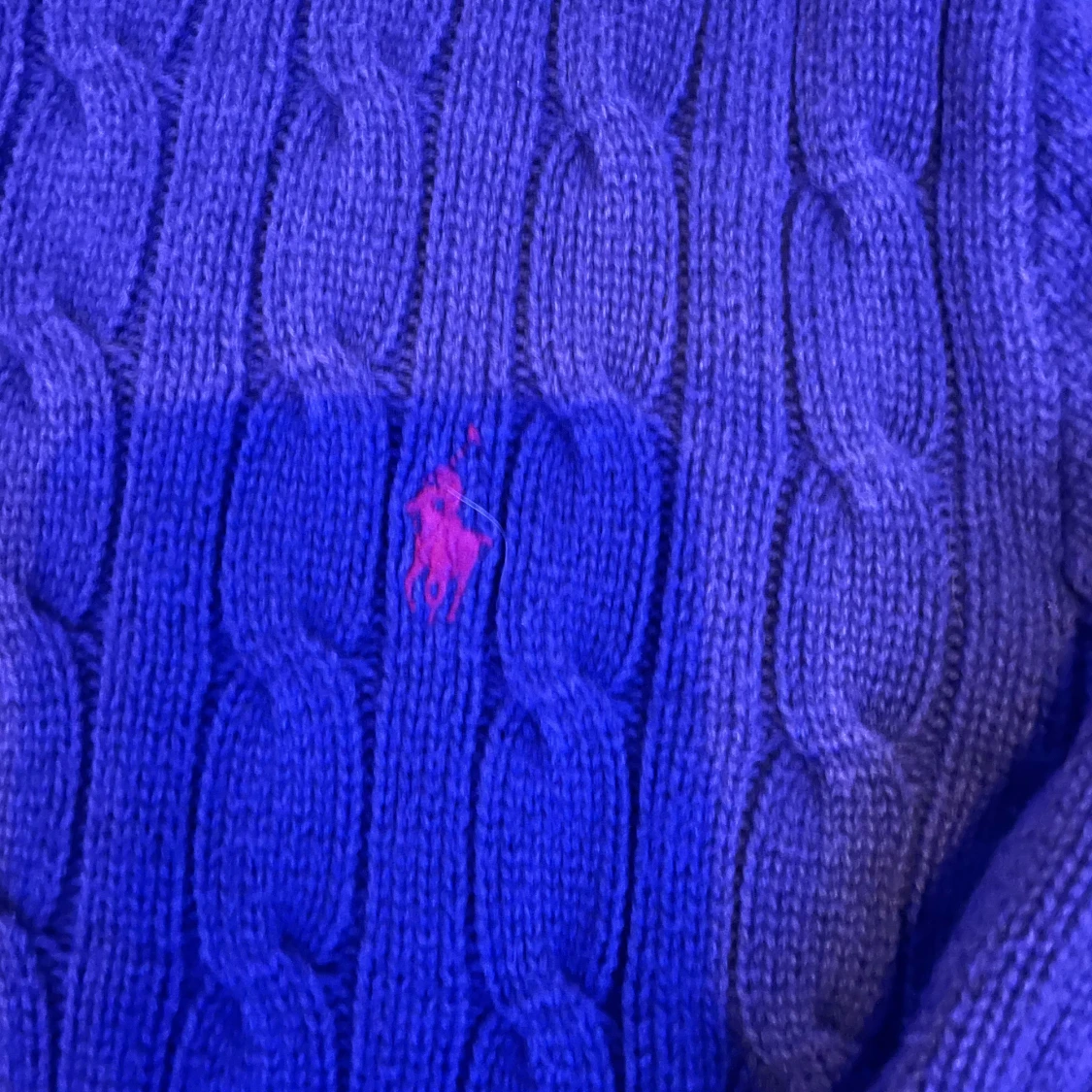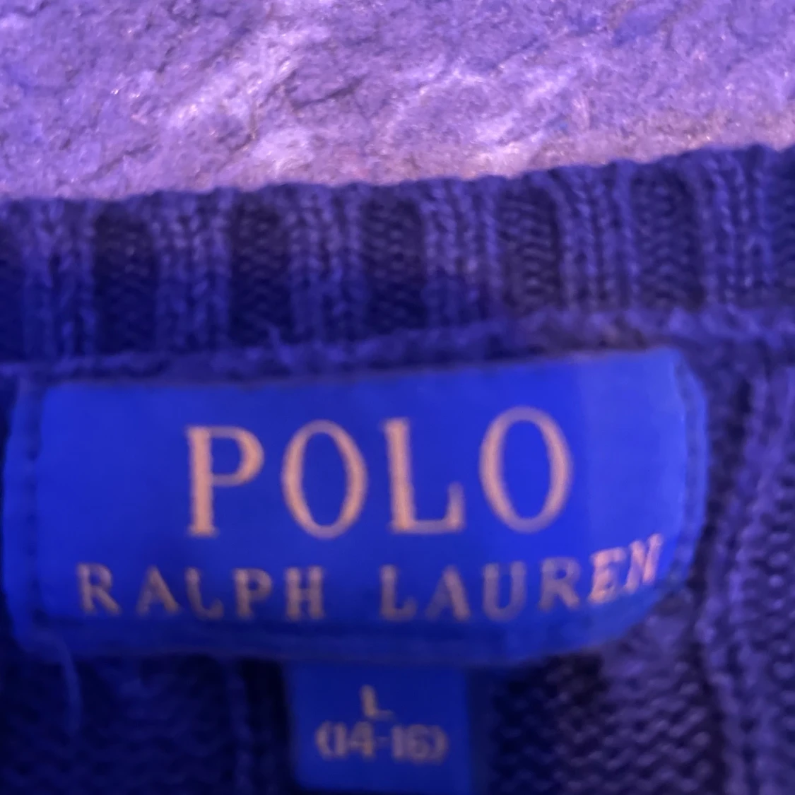 Ordinarie pris 1200 Storlek L14-16, passar dig som är mellan 160-165 .Kabelstickad mörkblå tröja från Polo Ralph Lauren med klassisk rund hals och lång ärm. Tröjan har det ikoniska rosa broderade logot på bröstet och breda ribbade muddar vid ärmslut och nederkant. Perfekt för lager-på-lager under kyliga dagar.