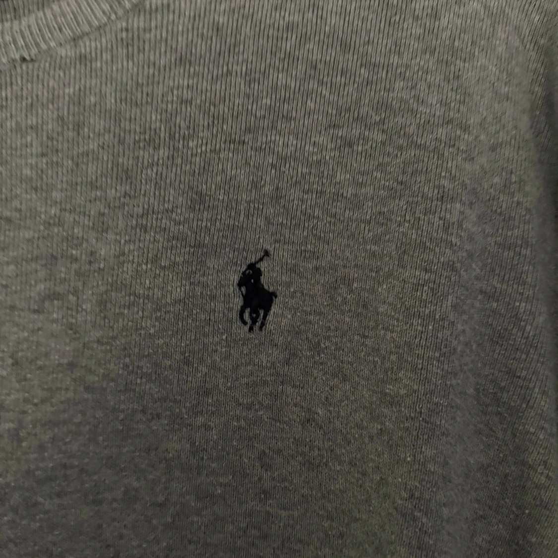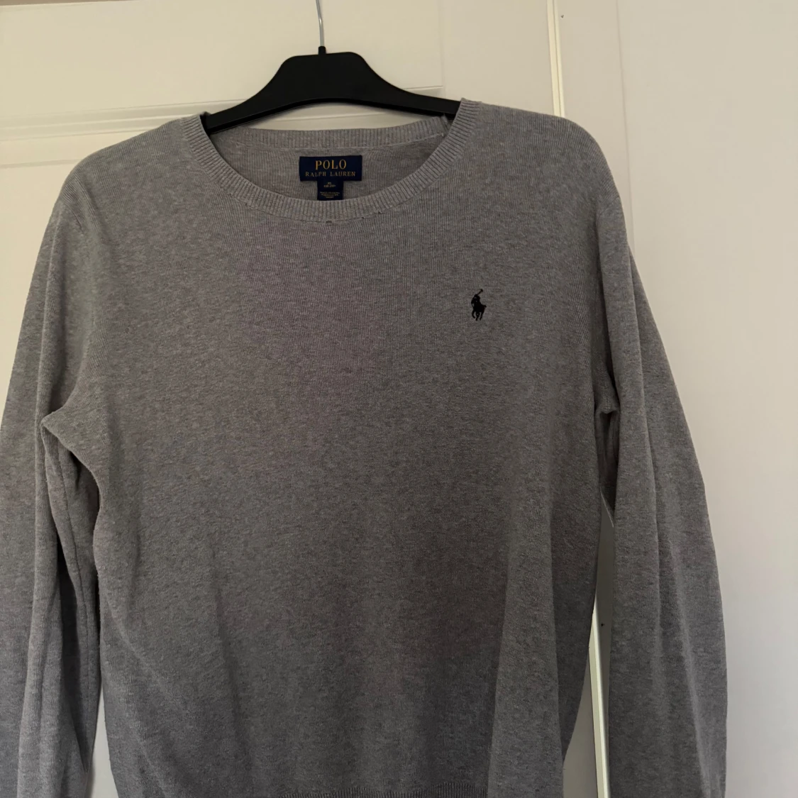 Säljer en stilren grå tröja från Ralph Lauren med deras ikoniska logga broderad på bröstet. Tröjan har långa ärmar och en rund halsringning. Perfekt för en avslappnad och snygg look. Storlek S/XS
