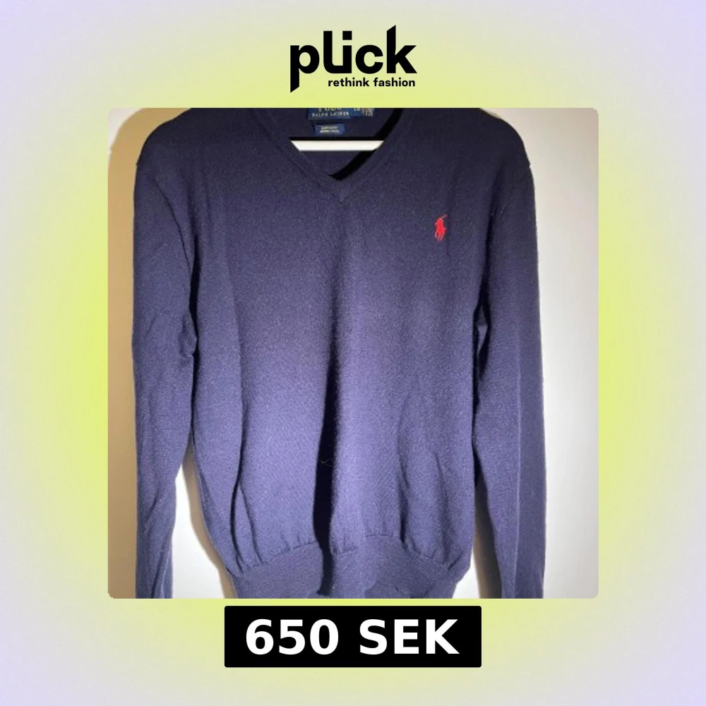 Säljer en stilren mörkblå tröja från Ralph Lauren i merinoull. Tröjan har en v-ringad design och ett rött broderat märke på bröstet. Perfekt för en klassisk look. Storlek L för barn passar S