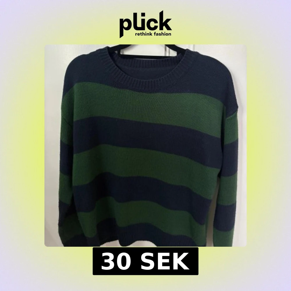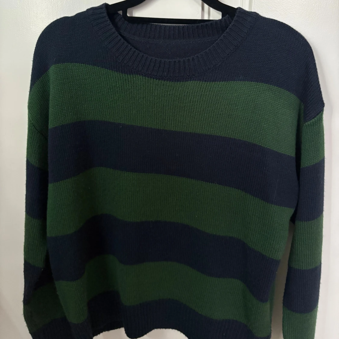 Snygg stickad tröja med breda mörkblå och gröna ränder. Modellen har rund hals och långa ärmar. Använd några gånger.