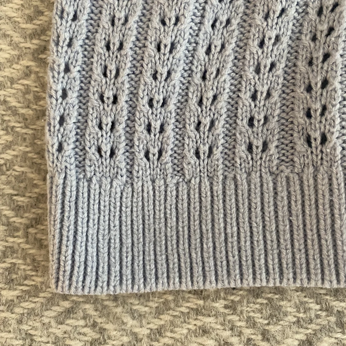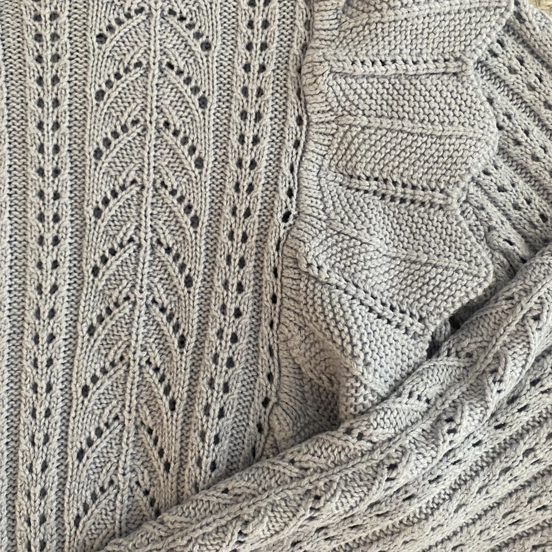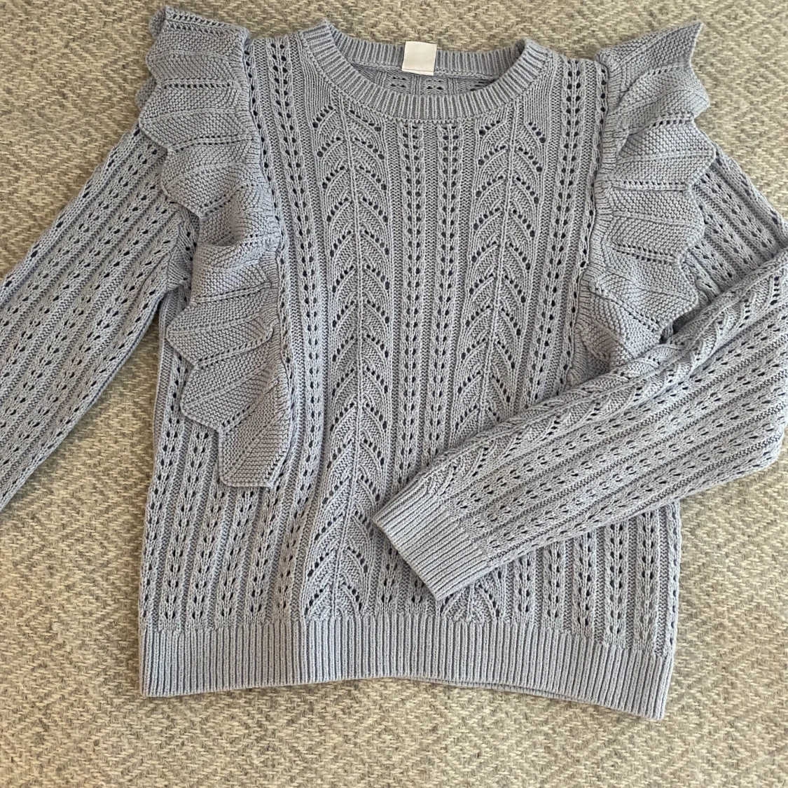 Jätte fin stickad tröja i lila nyans. Den har hål och mönster med två volanger vid ärmarna. Fint skick bara andvänd några fåtal gånger