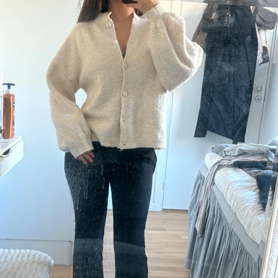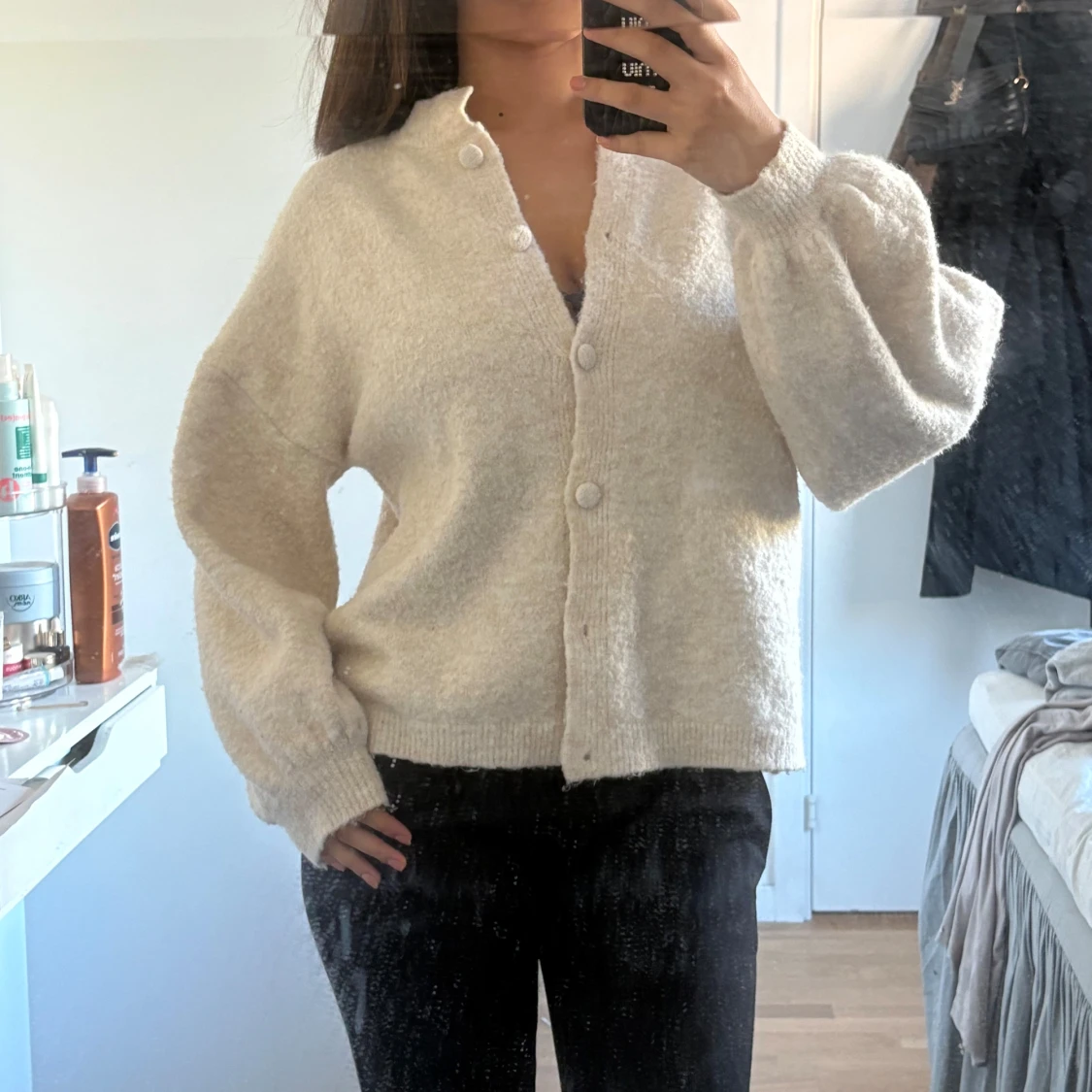 Supermjuk beige kofta från Dazy med puffiga ärmar.Storlek S, den har tre svarta fläckar på insidan som ej syns när den är på, de går säkert att ta bort, har inte försökt.