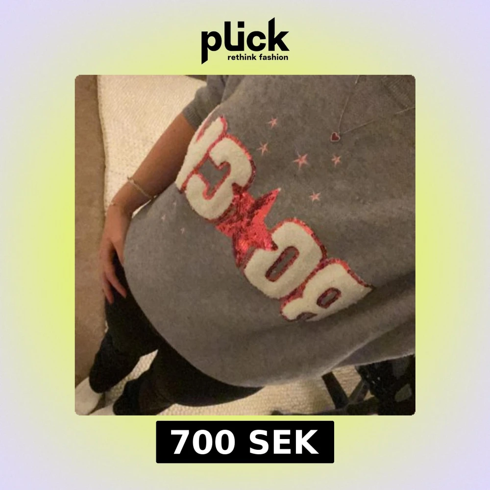 Säljer assnygg grå stickad tröja med texten 'ROCK' och paljetter🌺. Tröjan har långa ärmar och en rund halsringning❤️🥰Jag skulle säga att den är strl S/M. Är öppen för prutning!❄️