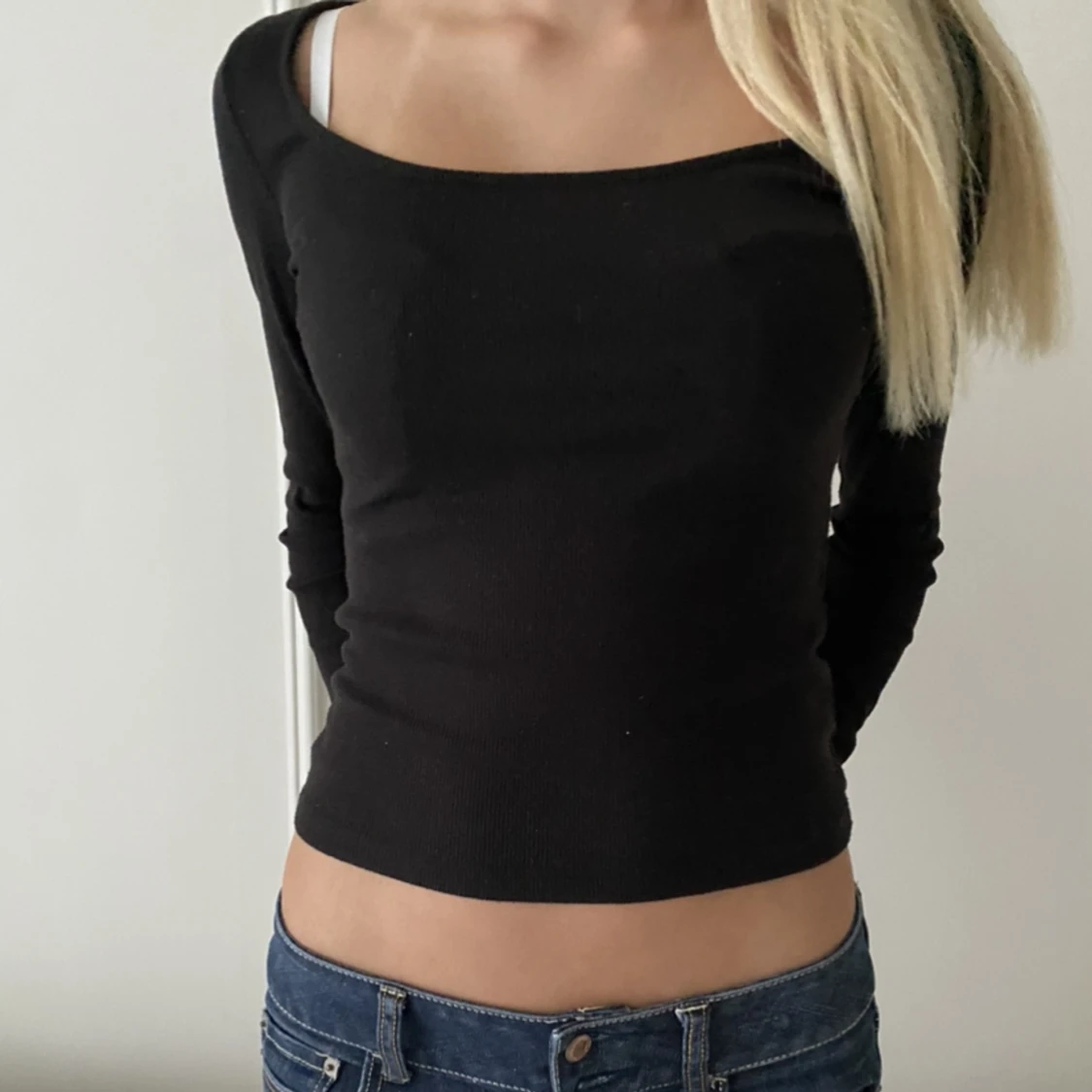 Jättefin svart långärmad tröja med urringning ifrån nakd, även jättefin att vända på för att få boatneck!