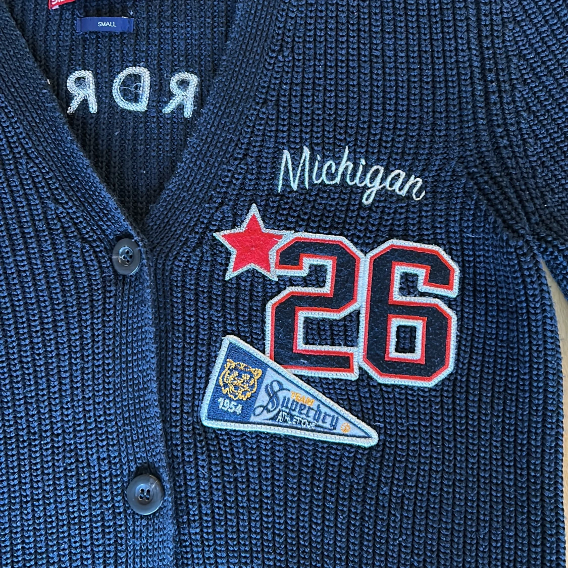 säljer denna sjukt feta cardiganen från superdry i utmärkt skick! Storleken är s passar m!